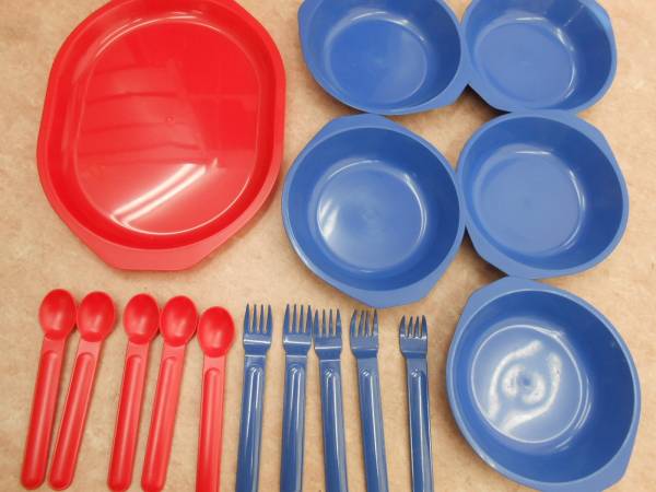 アウトドア用品/5人分/キャンプ/ケース付き/コップ黄色/コップ赤色/フォーク/スプーン/皿青色/皿緑色/大皿赤色/まな板1枚