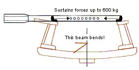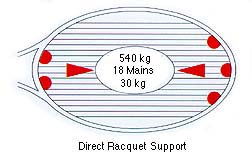 フレームの横に4つのサッポートがあり、横サッポートは縦ガットを引っ張る際ラケットの幅が大きくならないように押さえています。 ラケットには押さえる力(サポートで)と引っ張られる力(ガットの牽引で)の2つがかかり、結果ラケットへの負担が大変大きくなります。またラケットが変形しやすいです。