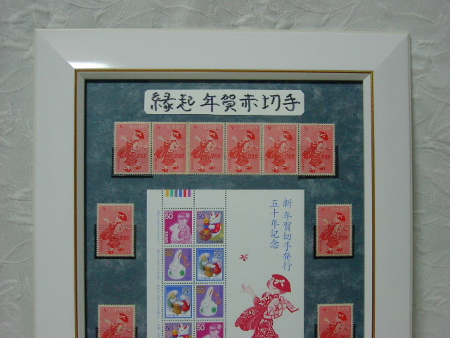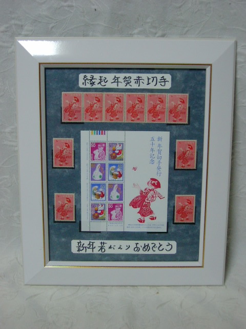 商品説明 ・・・   ガラス張りとした木額縁入りのインテリア アート、状態良好な未使用品「縁起 羽根つき」 年賀 赤切手 ( 昭和24 ) & 羽根つきシート ( 平成10年・年賀切手発行 五十年記念 ) です。本来で有れば 日光に晒されずアルバム中に収めるはずの切手群を額縁に収納し 壁掛け・机上とする事は、切手マニアからは多大なお叱りを受ける事は十分承知としていますが、常日頃から観賞し 心の拠り所を模索するインテリア アート品として「来客玄関先・個人書斎・接客応接間、そして贈答品用」として頂きたく思い 今回の特別出品と致しました。今回 出品の商品は、色合い そしてデザインも良く 毎年の年賀行事にも繰り返し再使用する事も出来、「昭和24年の年賀切手:羽根つき ( 俗称 ) や羽根つきシート 昭和24年や平成10年に若返る年 ( 新年 若返り おめでとう !? )」とするのも良いかも知れません ( )。木額縁入りのインテリア アート、状態良好な未使用品「縁起 羽根つき」 年賀 赤切手 & 羽根つきシートは如何でしょうか ・・。ちなみに額縁の大きさが 26,3cm / 高さ 31,5cm と成っています。( 一口メモ : 元気に 羽根つき して遊ぶ子供、楽しく快活なエネルギーが伝わって来る様に思います )