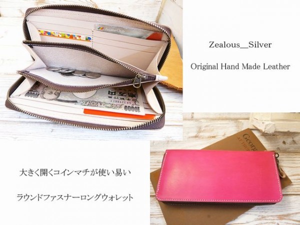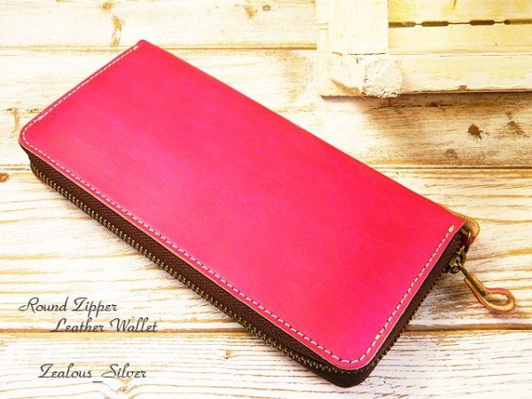 送料無料 コインマチが大きく開く!! ヌメ革 ラウンドファスナー ロングウォレット ハンドメイド 姫路レザー lwt60 手染めピンク