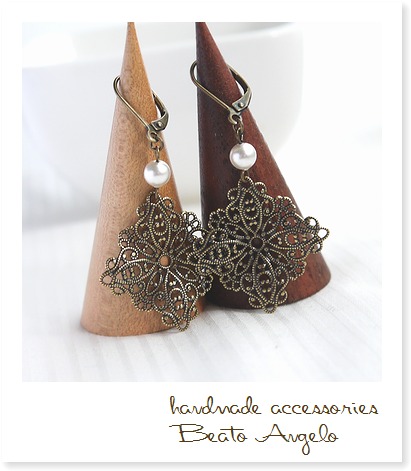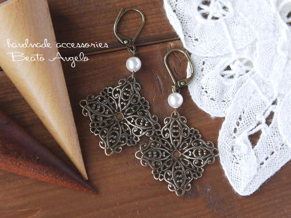 ♪♪+angelo+スワロフスキー パールとスクエア透かしのピアス(p-145)AG アンティーク フレンチフック