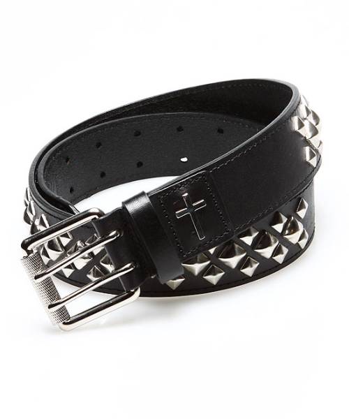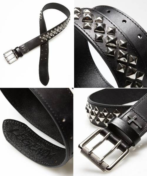 帯に大小のピラミッドスタッズを、菱形状にして規則正しく打ち込んだベルト。