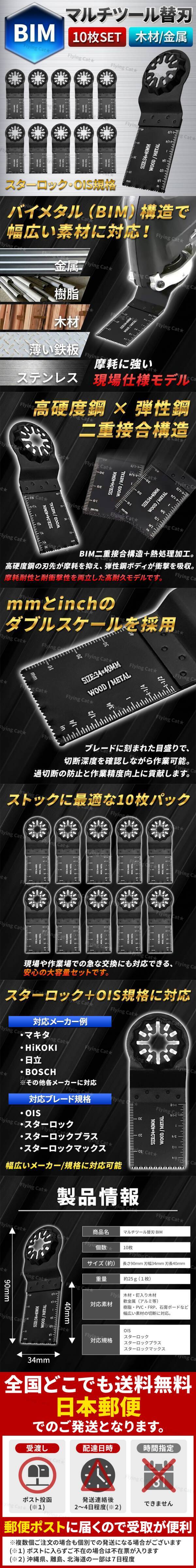 | 内容:BIM マルチツール替え刃 10枚セット サイズ約:刃幅34mm、刃長40mm、全長90mm 用途:軟金属、アルミ材、木材、プラスチック、石膏ボード、PVC、FRP、樹脂、釘など |