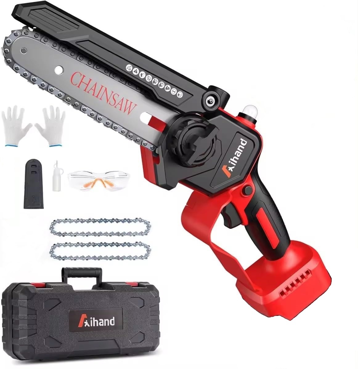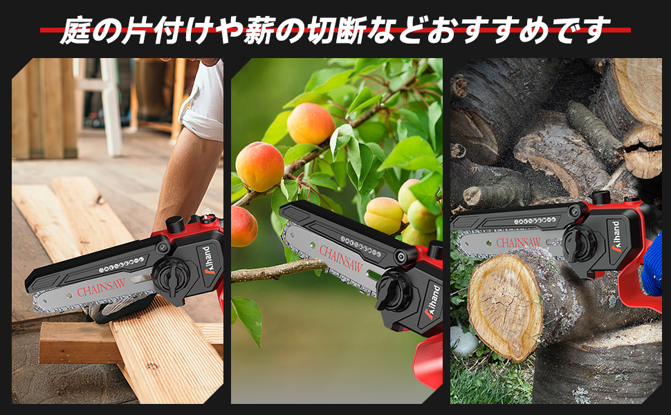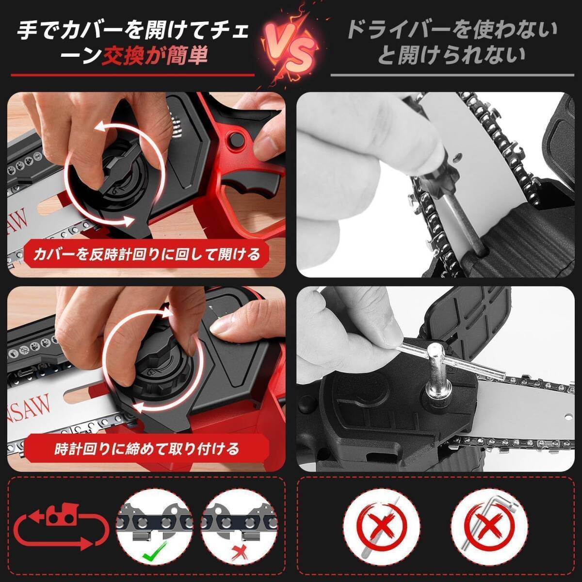 • 【工具不要&簡単操作】お客様から「チェーンソー 替刃の取り付け方が面倒」という声をいただきました。そこで、工具なしで簡単に行える3つのステップでチェーンを取り付ける方法をご案内します。1.手でカバーを開け、チェーンを交換します。2.ナットを回してチェーンの締め付けを調整します。ご注意:チェーンを引き下げると、3~5本のガイド歯が見えます。また、使用時には、まず安全ロックを開き、その後、使用するためにスイッチをオンにします。