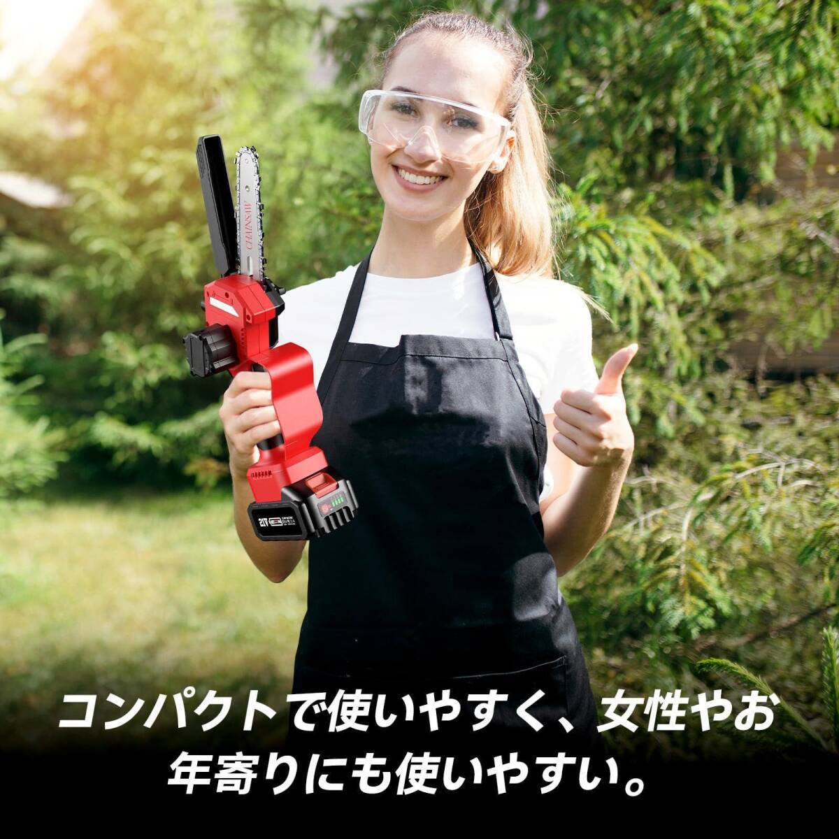 • 【コードレス &ハンディチェーンソー】この電動チェーンソーはコードレスで充電可能なデザインを採用しており、電源ケーブルの制約を受けずに使用できます。屋外やガーデニングなどさまざまな場面で便利にご利用いただけます。充電式の設計は電源コンセントに依存する必要がなく、より柔軟で便利です。また、このハンディ チェーンソーはわずか2.08キログラムと非常に軽量で、力のない方でも簡単にお使いいただけます。家庭のガーデニングやDIYに最適なお手伝いアイテムです。