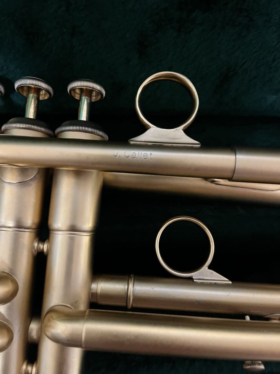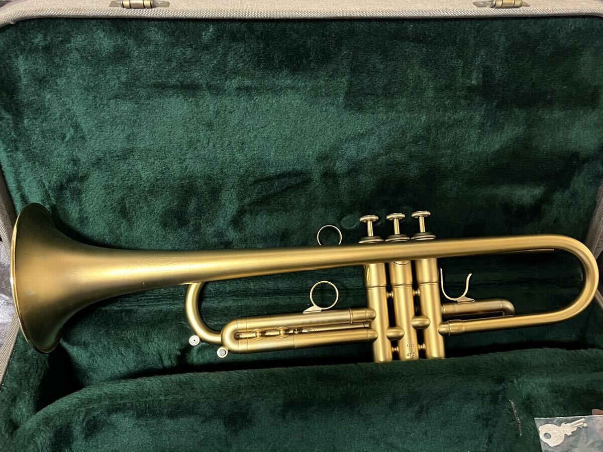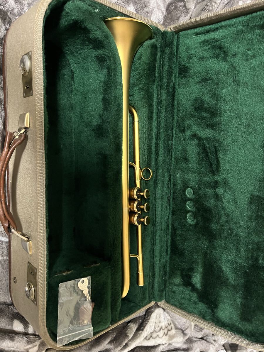 希少なハンドメイドのサテンゴールドプレートが美しいトランペットです、薄い線傷があります(画像6)、特に目立つ凹みはありません、ピストン、スライドは問題ありません、画像7は映り込みを消したものです、