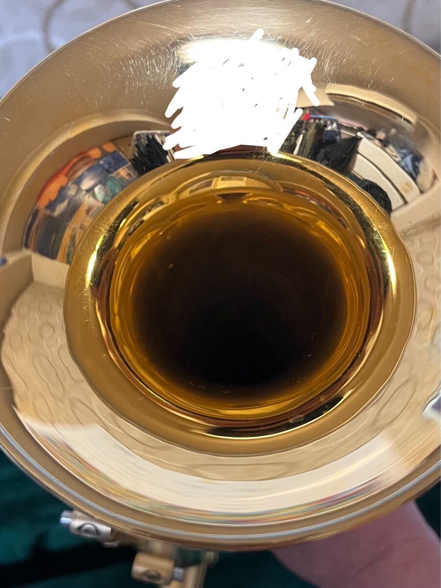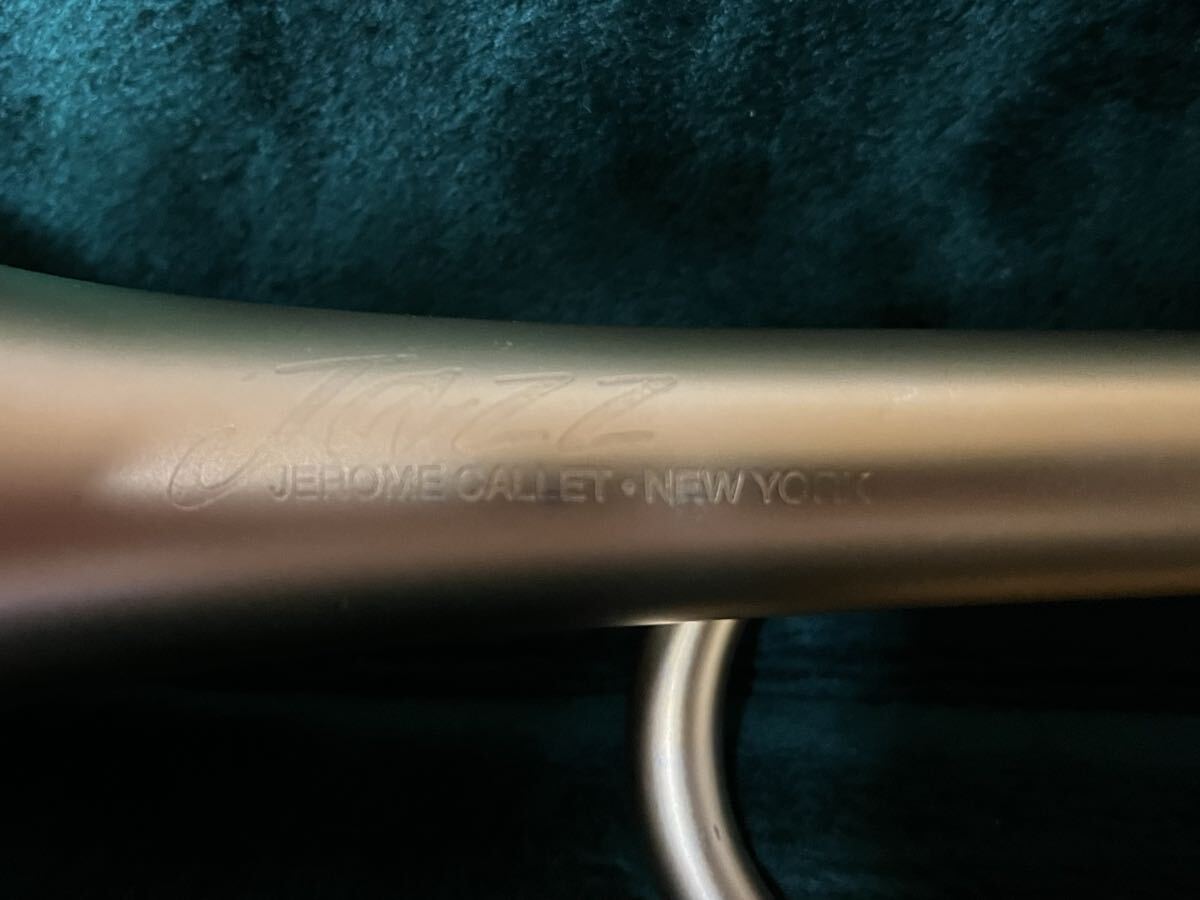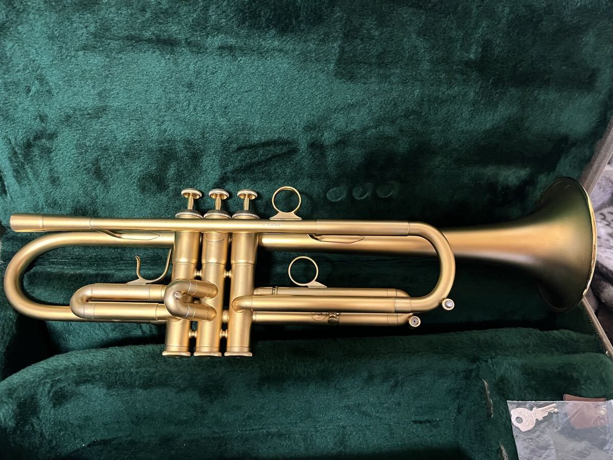 希少なハンドメイドのサテンゴールドプレートが美しいトランペットです、薄い線傷があります(画像6)、特に目立つ凹みはありません、ピストン、スライドは問題ありません、画像7は映り込みを消したものです、