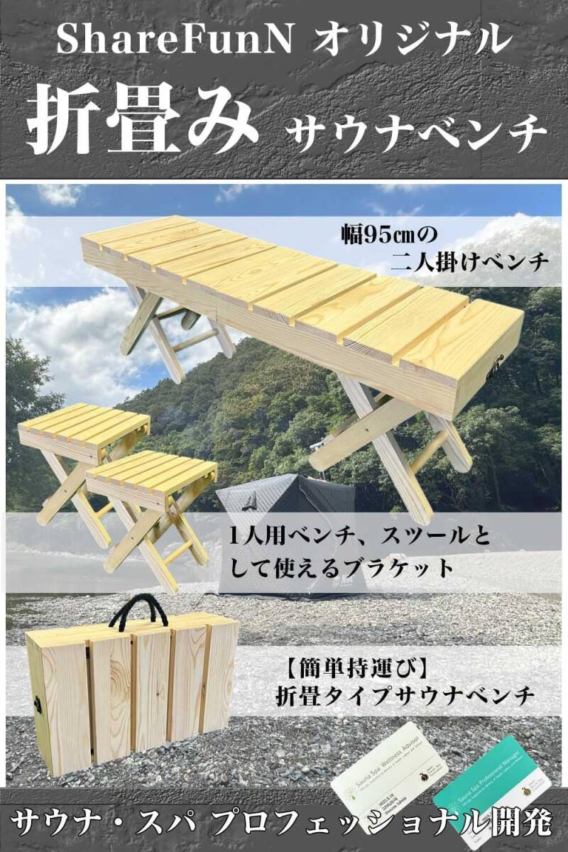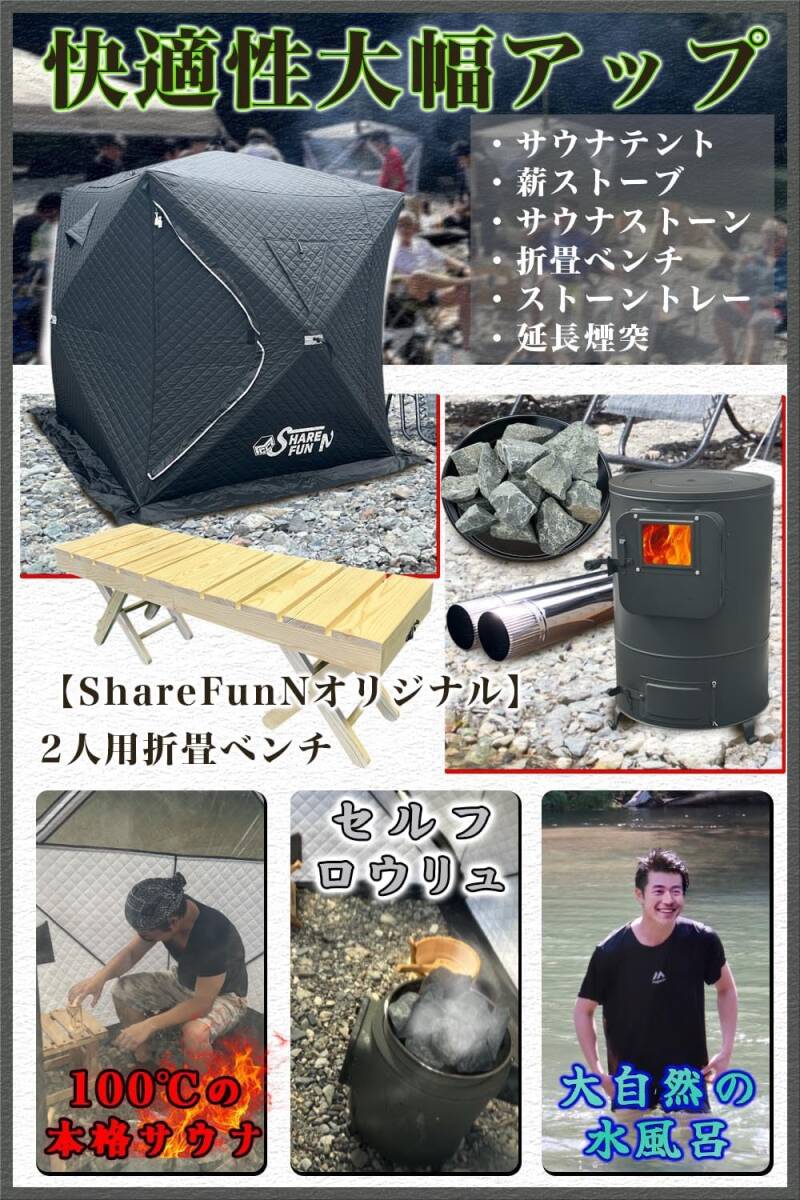 • 【ベンチセット】アウトドアサウナをすぐに始められる、最適セット。ShareFunNオリジナルの折畳サウナベンチがセットになって、サウナ中の居住性を高めました。ポップアップ式の簡単設営のテントでサウナ、ロウリュが楽しめる。レギュラータイプ&パノラマタイプの選べる2タイプ。
