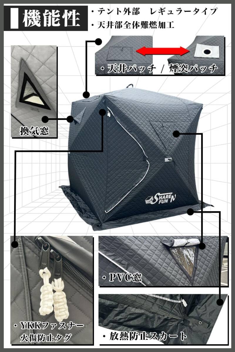 • 【テント生地】ポリエステル210Dオックスフォード(中綿120g / ㎡ ) キルティング加工 耐久性・保温性に優れるサウナテントに適した仕様になっています。雨天での野外使用は想定しておりませんのでご了承ください。