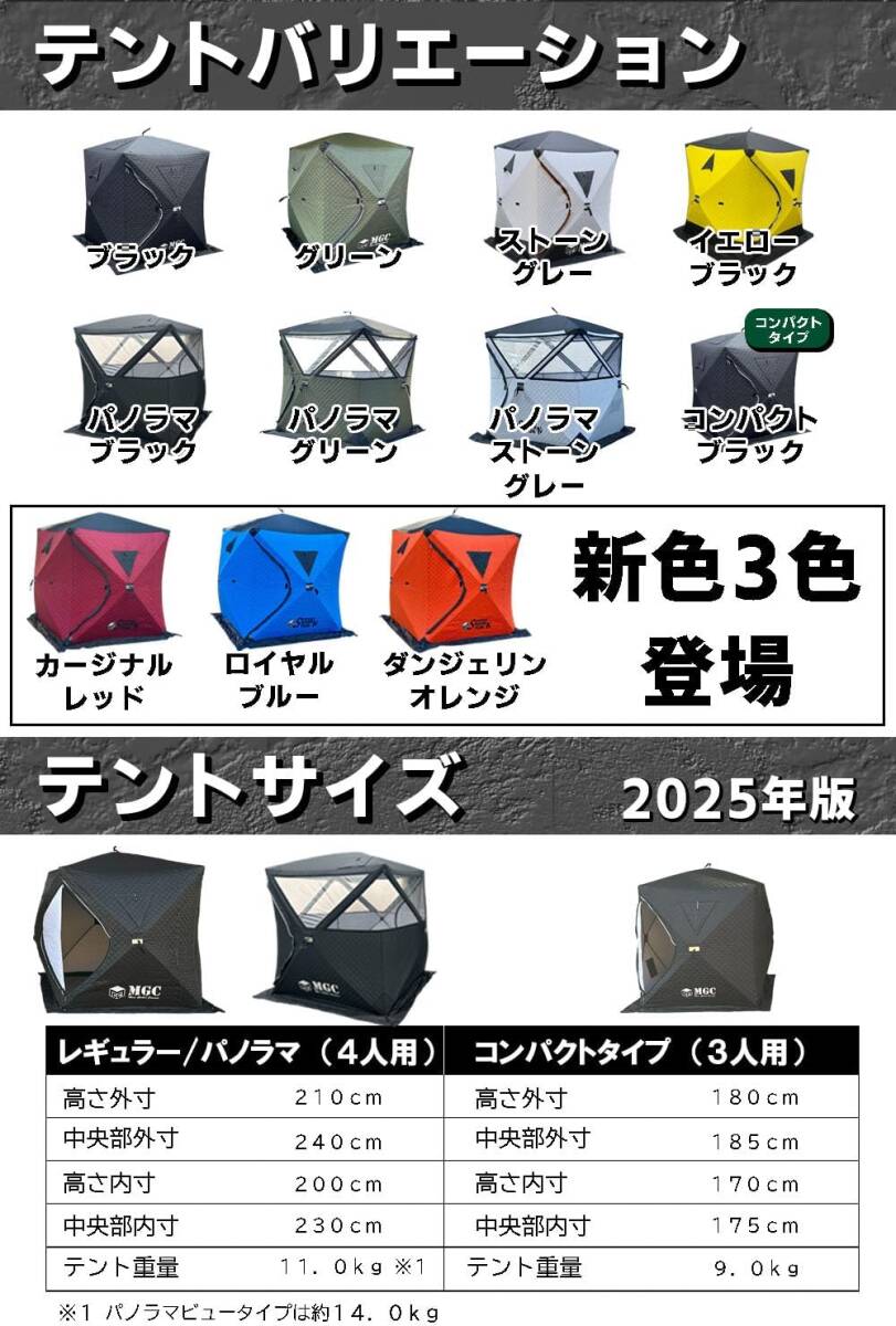 • 【テント外寸サイズ】幅240cm×奥行240cm×高さ210cm 【テント内寸サイズ】幅230cm×奥行230cm×高さ200cm 【テント収納時サイズ】25cm×25cm×130cm 重量 レギュラー:約11.0Kg パノラマ:14.0kg