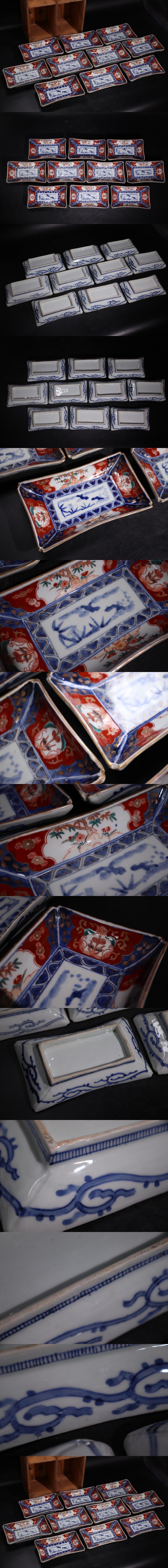 | 時代 古伊万里 錦手 長方 皿 十客 木箱付 / 伊万里 有田 色絵 赤絵 茶器 煎茶道具 .G3008 |