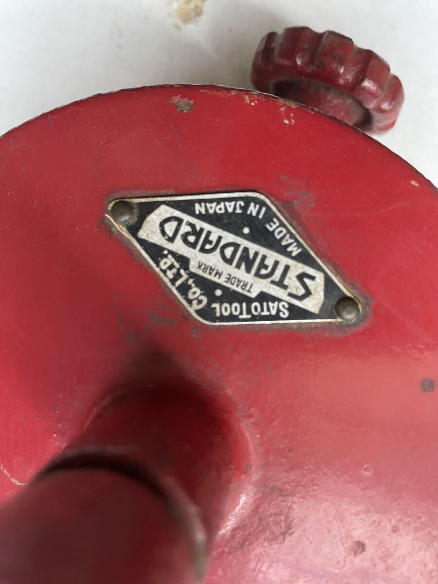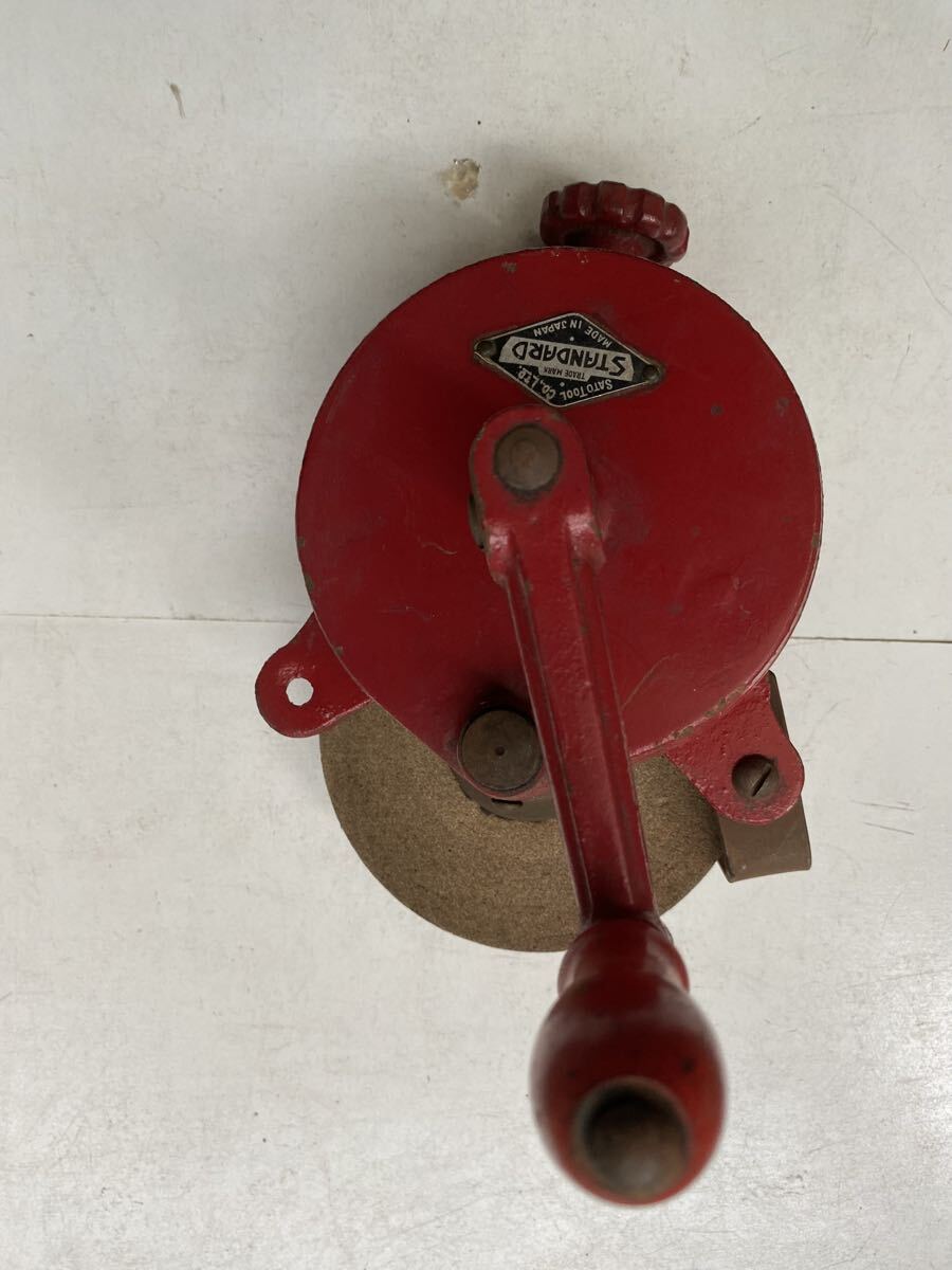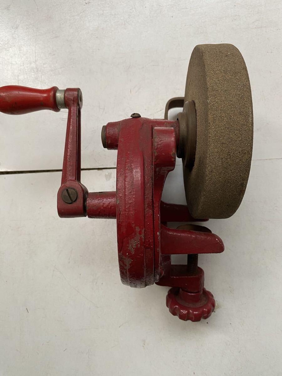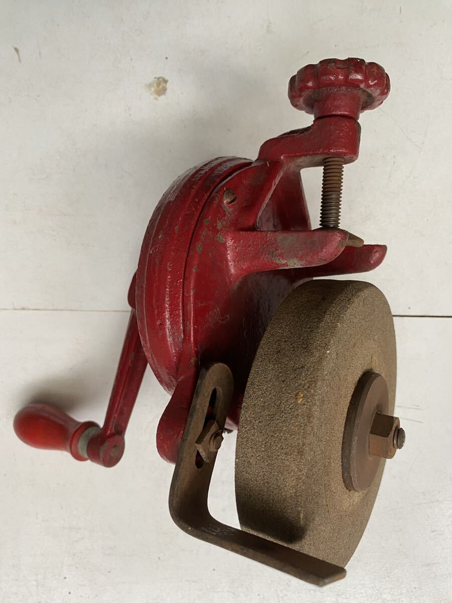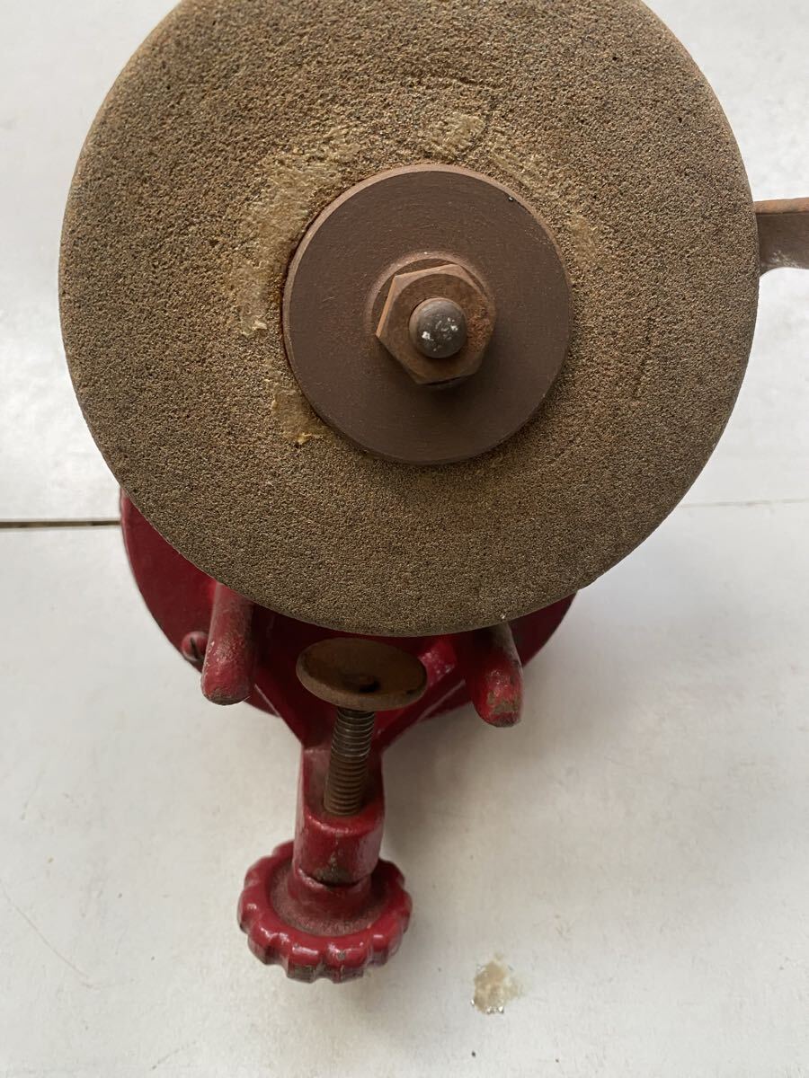 テーブルなどに固定して使う物だと思います。ハンドルを回して砥石が回転するのは確認出来ました。詳しい事は分かりません。