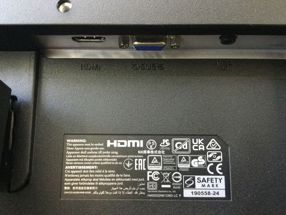 入力端子: VGA(アナログ)、HDMI(デジタル、HDCP) 各1