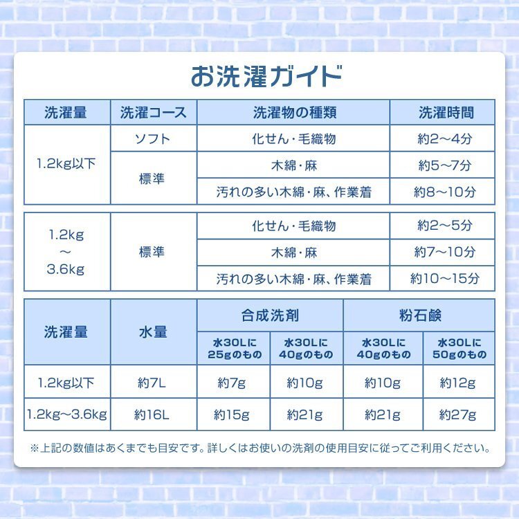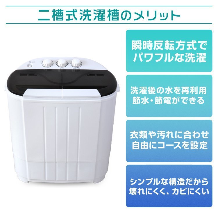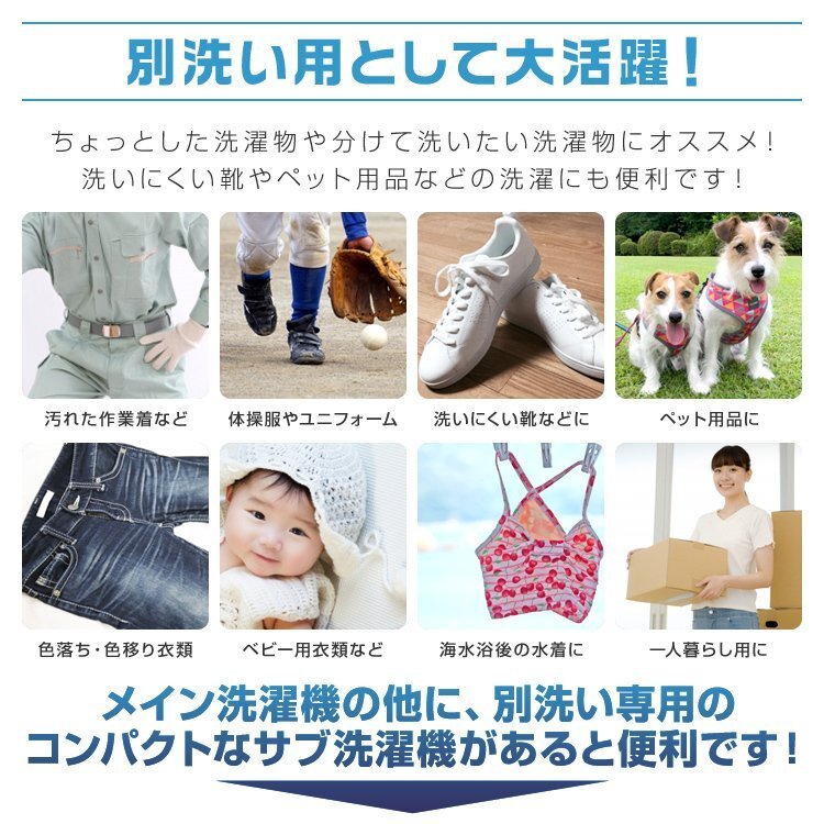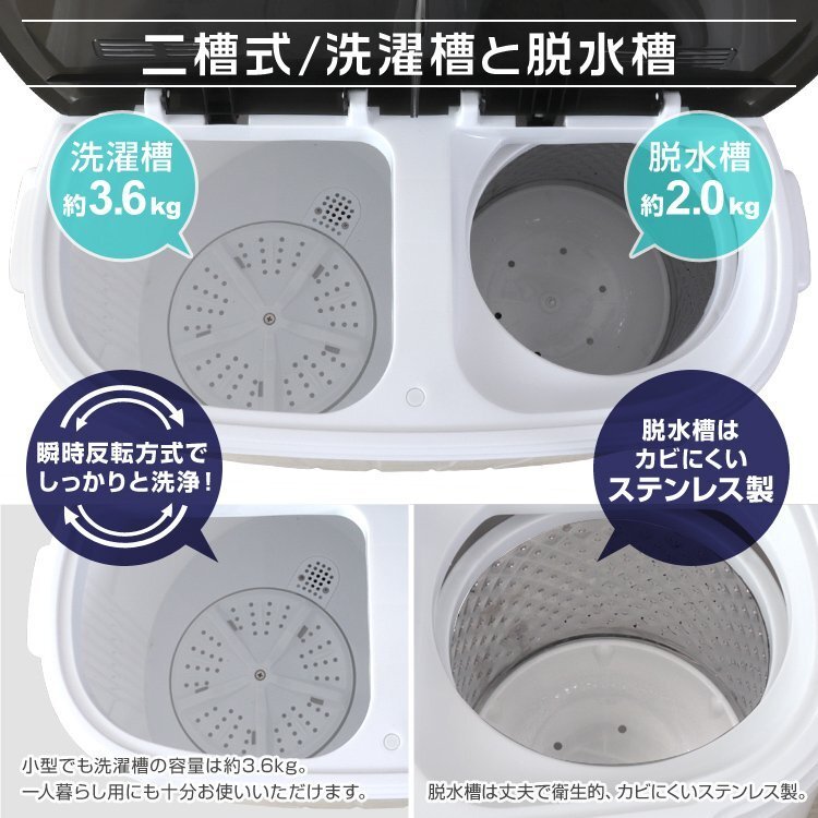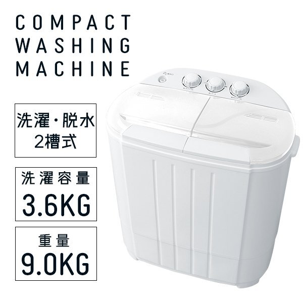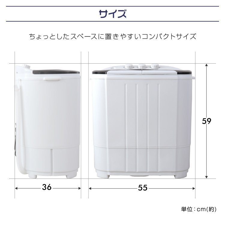 | コンパクトだから場所も取らずにちょこっと洗いで節水もできます。 少量の洗濯物や洗い分けに最適! 二槽式だからしっかり洗えてしっかり脱水可能! ★こんな場合にオススメ!★ ・ガーデニングや作業で汚れた軍手やエプロンの洗濯 ・学校や部活動で汚れたシューズや服の下洗い ・ベビー用衣類の洗濯 ・海水浴後の水着の洗濯 ・別洗い用のサブ機として 【商品仕様】 カラー:ホワイト サイズ:(約)幅550×奥行360×高さ590mm 重量:(約)9000g 洗濯容量:3.6kg 電源:AC100V 50/60Hz 定格電力:洗濯:240W 脱水:120W 防水性能:IPX4 【商品内容】 本体 脱水用おさえさえフタ 吸水ホース 【注意事項】 ・本製品の脱水は、簡易脱水となっております。あらかじめご了承ください。 ・水がこぼれても大丈夫な風呂場やベランダなどでのご使用をオススメします。 ・分解や修理・改造をしないでください。 ・保管する時は、風雨にさらされる場所や湿気の多い場所に置かないでください。 |