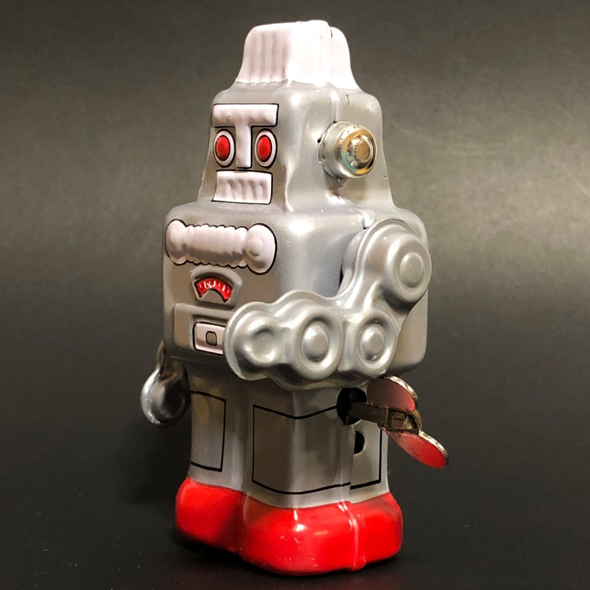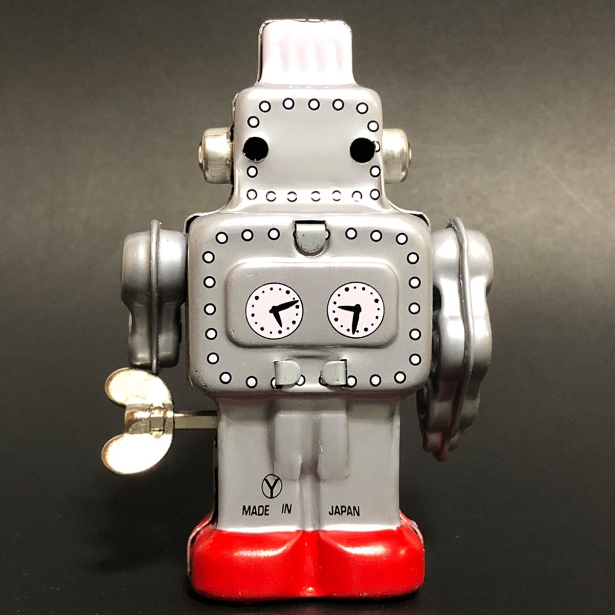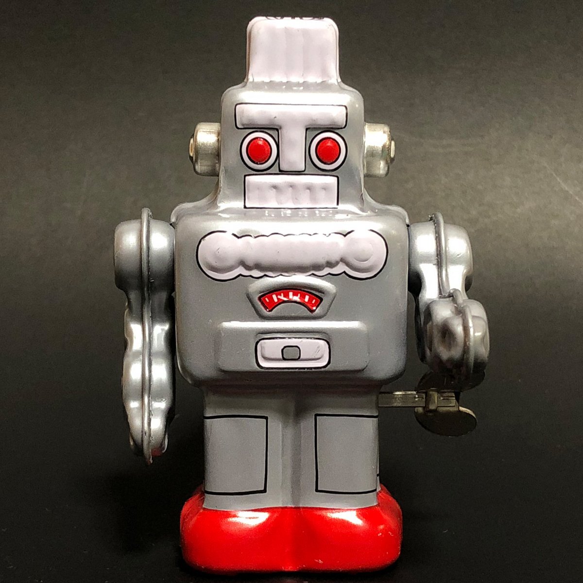 スイッチ一つで動く電気仕掛けのおもちゃとは異なり、一度ゼンマイをまきスタートさせる。 ゼンマイをまくのにも加減を覚え、半永久的に遊べるゼンマイ式 そしてプラスチックとは一味違うブリキならではのリアルなブリキ玩具。 この東京 葛飾三幸製作所製のゼンマイ ロボット。昨今 進化が止まらないAIロボット。 その人間然としたスマートさとはかけ離れ 昭和のロボットと言えば このダンボールでもできるこの形! 四角い形に目鼻口をつけただけで出来上がりです。 電池池仕掛けではありませんが、三幸製作所ゼンマイ仕掛け、ゼンマイの回転力で足代わりのロッドをかわるがわる動かしカタンカタンとぎこちなく前進していきます。 このぎこちない歩みもいかにも昭和という感じです。 また同じデザイン石を剃って発光しながら歩くスパークリングロボットのベースとなったモデルで、発光窓のない初期デザインプリントの シンプルさが可愛いモデルです。 ゼンマイ仕掛けですの出電池が切れる事もなく、少々落としたぐらいでは壊れない環境にもやさしいおもちゃです。 Made in Japan. |