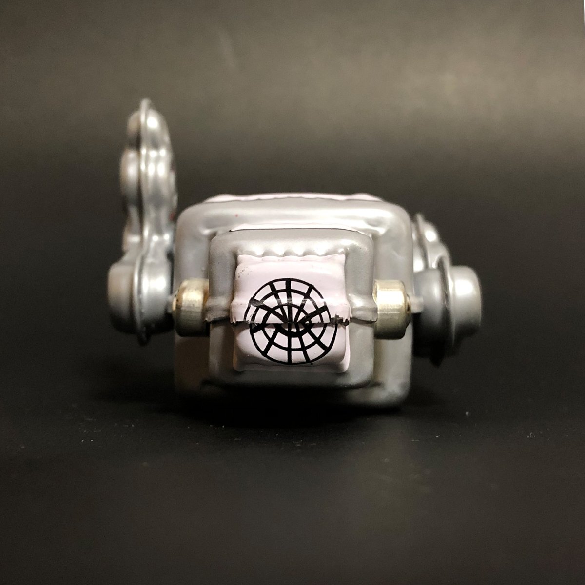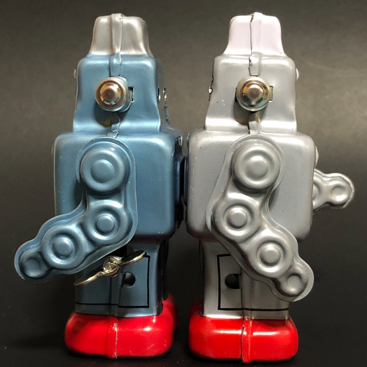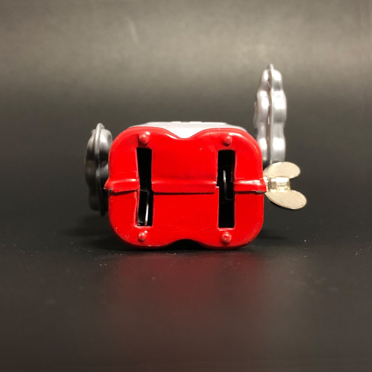 スイッチ一つで動く電気仕掛けのおもちゃとは異なり、一度ゼンマイをまきスタートさせる。 ゼンマイをまくのにも加減を覚え、半永久的に遊べるゼンマイ式 そしてプラスチックとは一味違うブリキならではのリアルなブリキ玩具。 この東京 葛飾三幸製作所製のゼンマイ ロボット。昨今 進化が止まらないAIロボット。 その人間然としたスマートさとはかけ離れ 昭和のロボットと言えば このダンボールでもできるこの形! 四角い形に目鼻口をつけただけで出来上がりです。 電池池仕掛けではありませんが、三幸製作所ゼンマイ仕掛け、ゼンマイの回転力で足代わりのロッドをかわるがわる動かしカタンカタンとぎこちなく前進していきます。 このぎこちない歩みもいかにも昭和という感じです。 また同じデザイン石を剃って発光しながら歩くスパークリングロボットのベースとなったモデルで、発光窓のない初期デザインプリントの シンプルさが可愛いモデルです。 ゼンマイ仕掛けですの出電池が切れる事もなく、少々落としたぐらいでは壊れない環境にもやさしいおもちゃです。 Made in Japan. |