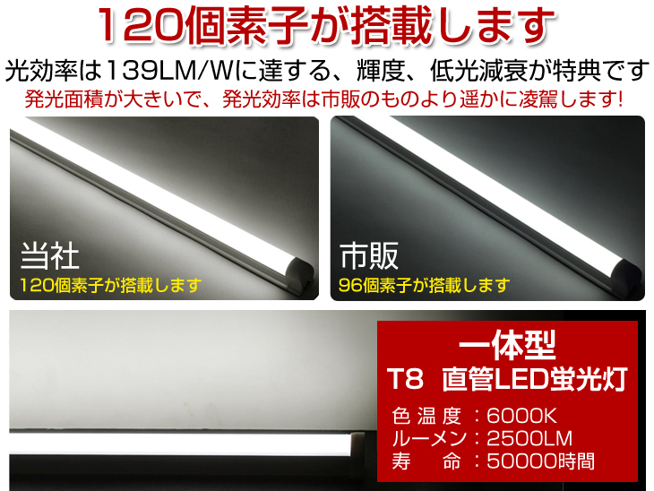 T8 一体型直管形蛍光灯40W形対応、2500ルーメンLED蛍光灯です。発光効率が高い! ◆優れたLEDチップ採用: 驚異的な照射能力と耐久性が持ってます。ムラなく均一の発光で、すっきりと対象物を照らします。 ◆発光源は精銅スタンドを採用します: 熱伝導性と導電性は普通より優れた。チップの発熱量は最小限になります。高輝度低光減衰の特典:3000時間で光減衰率は2%左右です。優れた静電気保護で50000時間以上の長寿命をもつ。 ◆驚きの長寿命: LEDの放熱率が少ない、光衰えも低い、寿命は一層長くなります。 ◆航空アルミを採用: 航空アルミニウムを採用して散熱性能は強くなり、熱で変形しにくいです。 ◆安全性が高い: