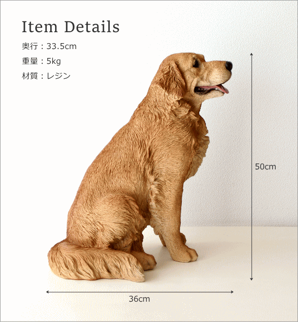| まるで本物のワンちゃんがいるような とても精巧に作られたオブジェです 事情があって ペットが飼えないお宅に とってもおすすめです 玄関に座らせると いつも優しい顔で出迎えてくれ 思わず、撫でたくなります 商品名 : ゴールデンレトリバーのオブジェ お座り 商品番号 : nrv8434 全体サイズ(cm) : 幅36×奥行33.5×高さ50 材質 : レジン 重量 : 5kg 生産国 : 中国 ※手作り品のため色ムラ、小さな擦り傷などはご容赦ください ※ディスプレイによる色の違いはご了承下さい |