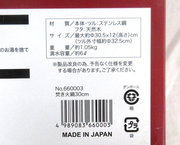 | 内 容 | ■UNIFLAME 焚き火鍋 30cm(660003) ■サイズ:φ30.5×H12cm ■満水容量:約6L ■日本製 ◆参考価格 7150円相当 焚き火で使いやすいステンレス製ツル付きのお鍋です。 大人数の鍋料理にオススメ。 |