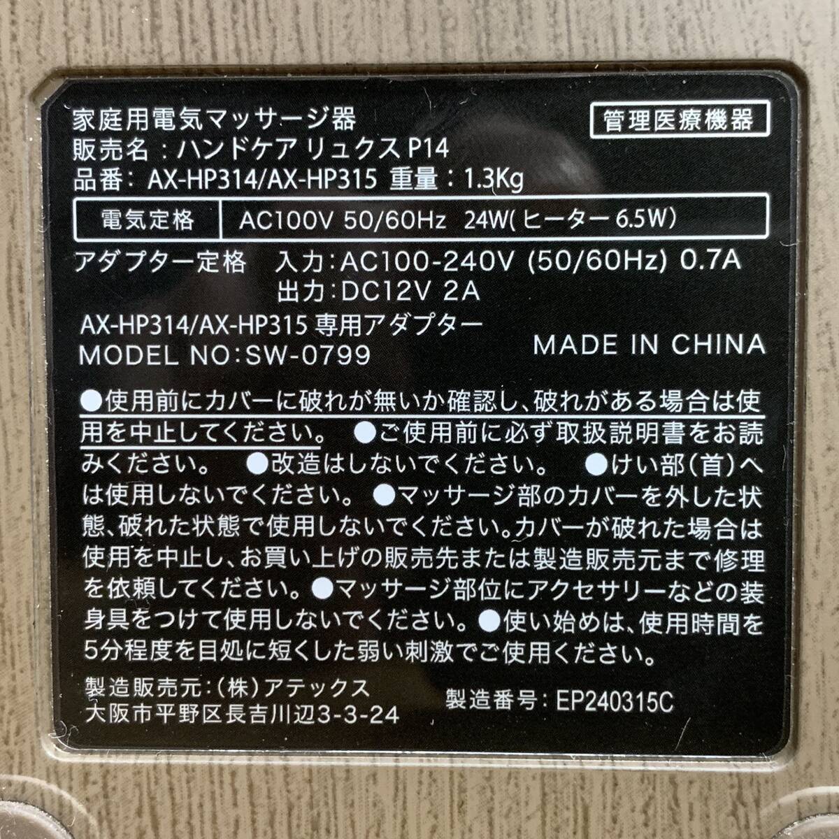 | 商品名 | アテックス ATEX TOR ハンドケアリュクス マッサージ器 ハンドケア マッサージ機 AX-HP314 |