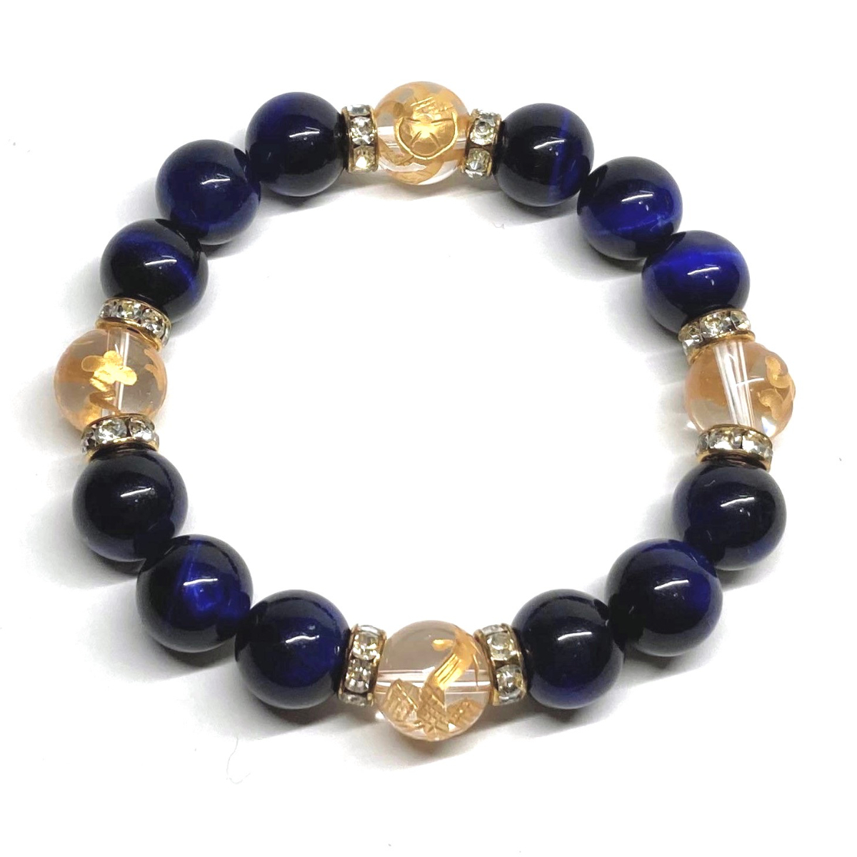 四神獣金彫水晶×ブルータイガーアイ 12mm パワーストーン ブレスレット天然石 青龍 白虎 玄武 朱雀 運気上昇 お守り 四神獸 四神相応 G