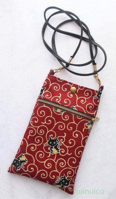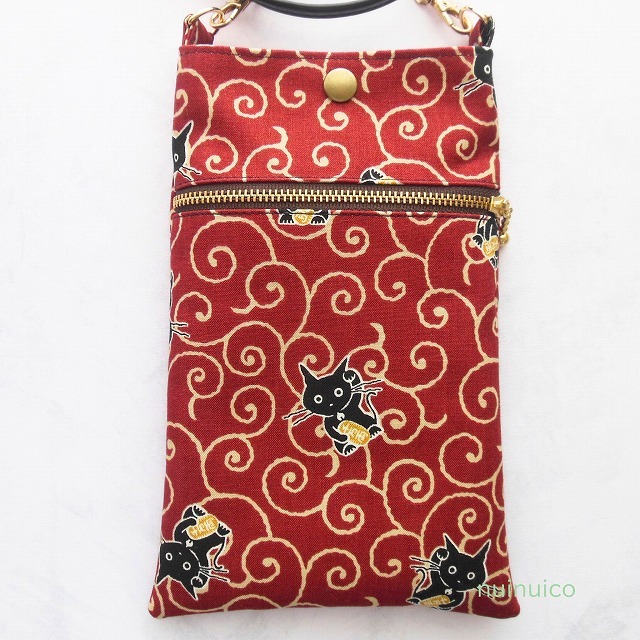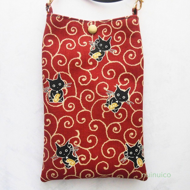 かわいい招き猫柄生地で作ったスマホショルダーです。お散歩でも活躍してくれる大きさです。