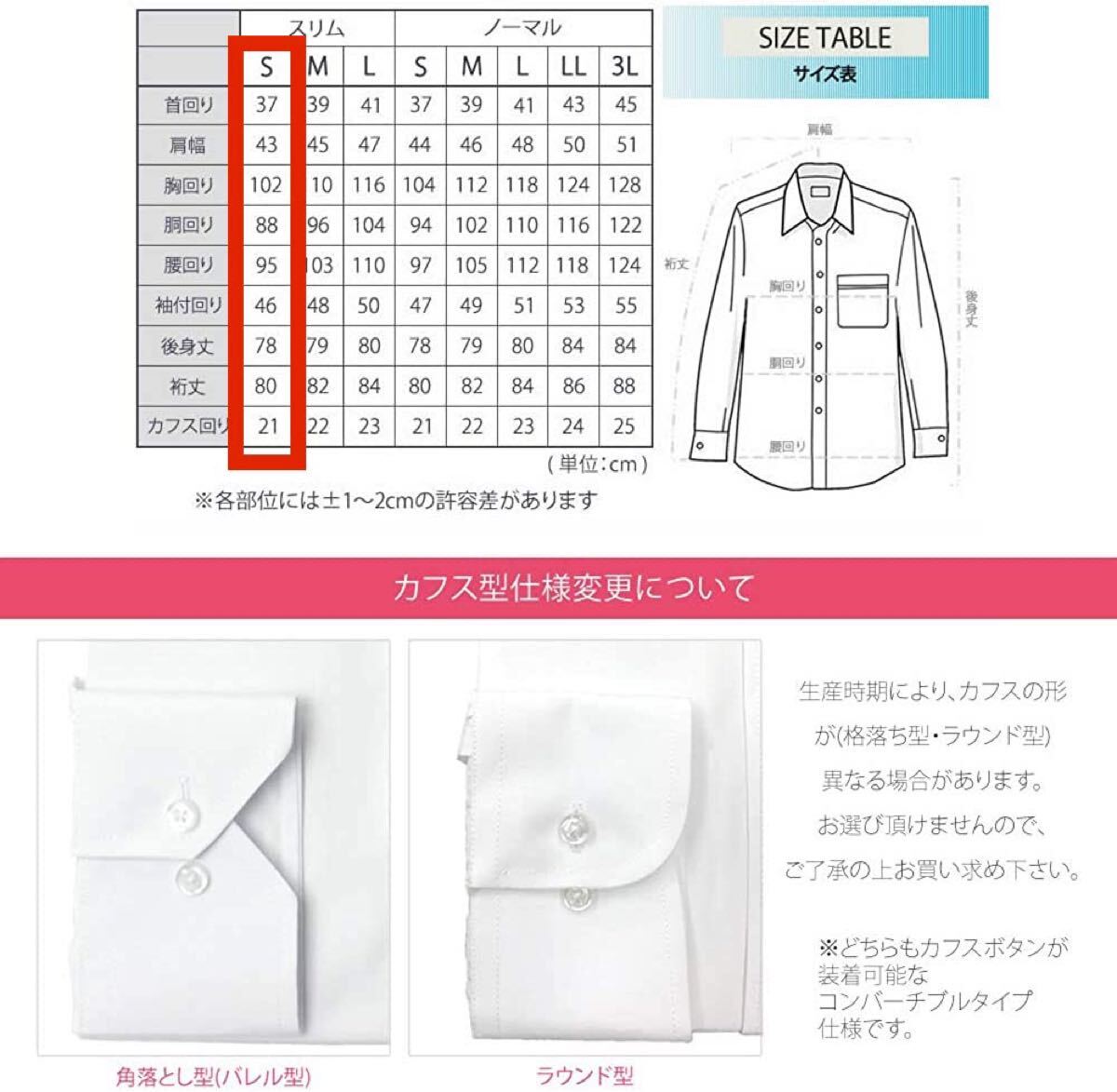 ワイシャツはスリムタイプです、詳しくは以下の寸法でご確認ください。形状安定です。