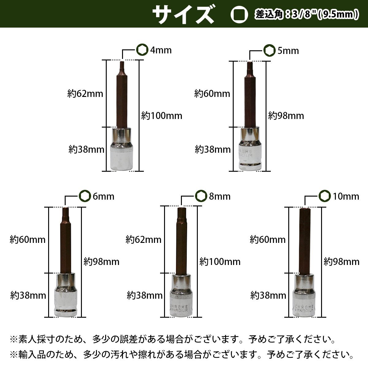 【新品即納】 4mm/5mm/6mm/8mm/10mm 5本セット 差込角 3/8インチ ヘックスビットソケットセット ロングタイプ ヘックスレンチ