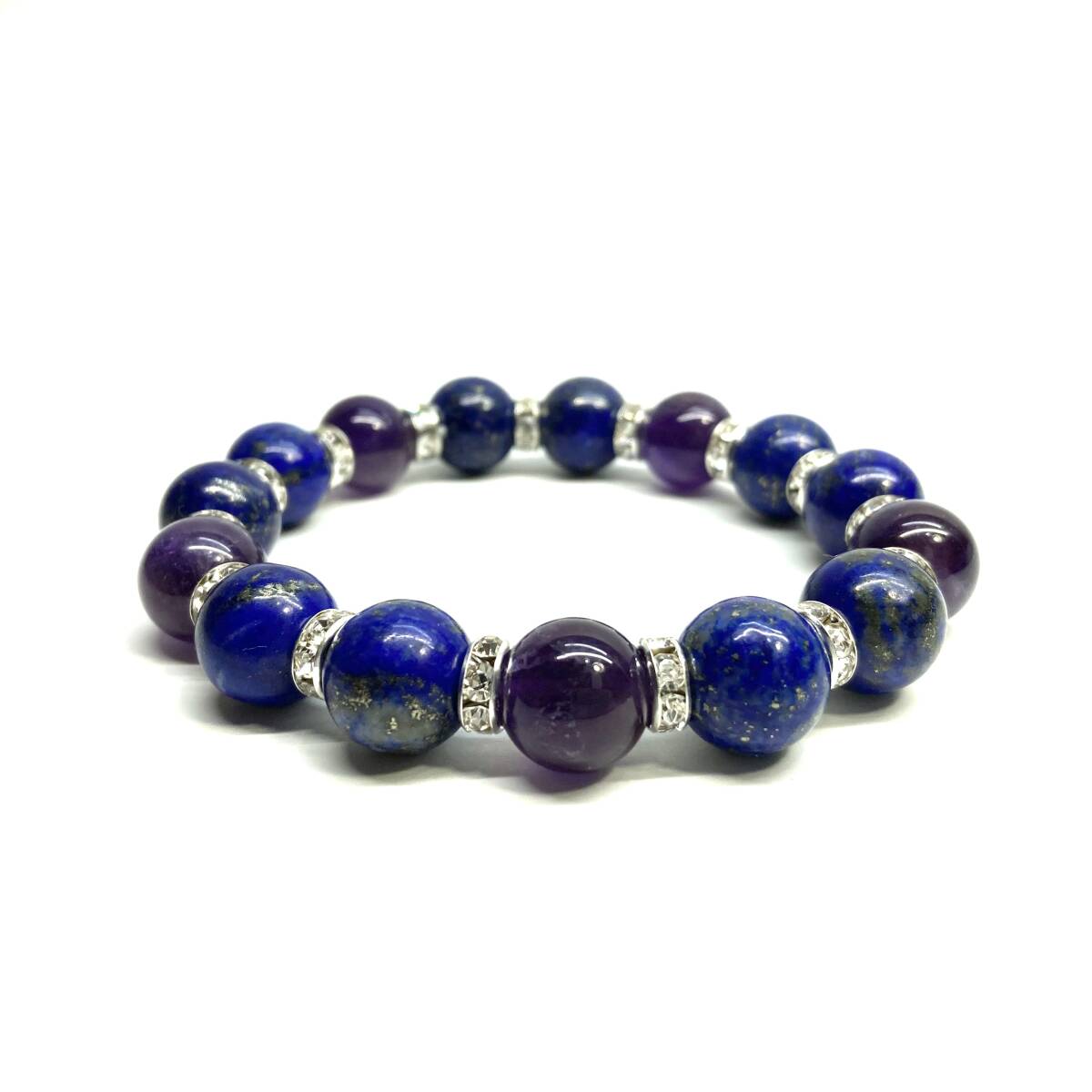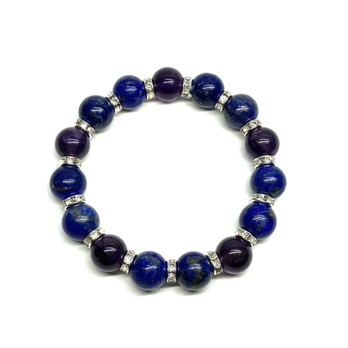 こちらは、ラピスラズリとアメジストを組み合わせたパワーストーンブレスレットです。間にはロンデルを挟み高級感あるデザインに仕上げております。程よくインパクトがある12mm玉を使用して内周約18cmです。(サイズ変更の場合は取引ナビにてご連絡をお願いします。) 数に限りがございますので気になる方はお早めにどうぞ。