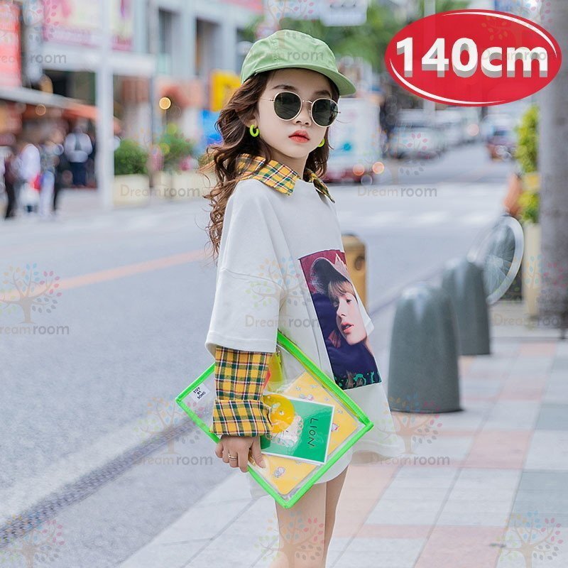 kids タータンチェック シャツ重ね着風 トップス 【140cm】ホワイト 女の子 ロンT 学生 秋服 長袖 K-418bk