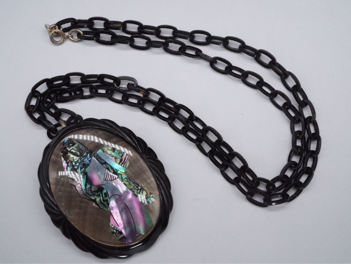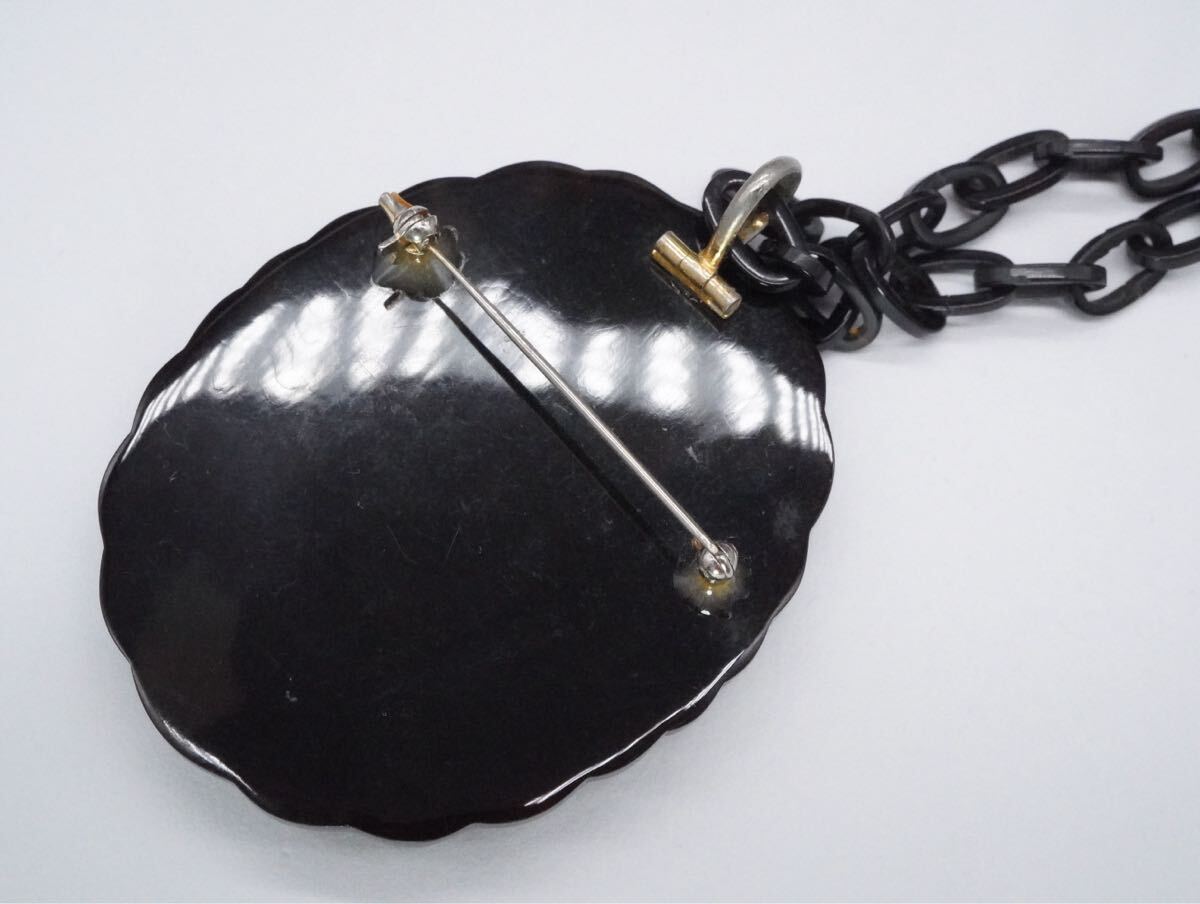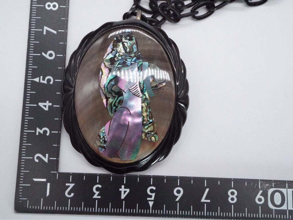 【251】黒蝶貝 アバロン 鼈甲 ベッコウ べっ甲 ロング ネックレス 長さ約62cm ブローチ アクセサリー TIA
