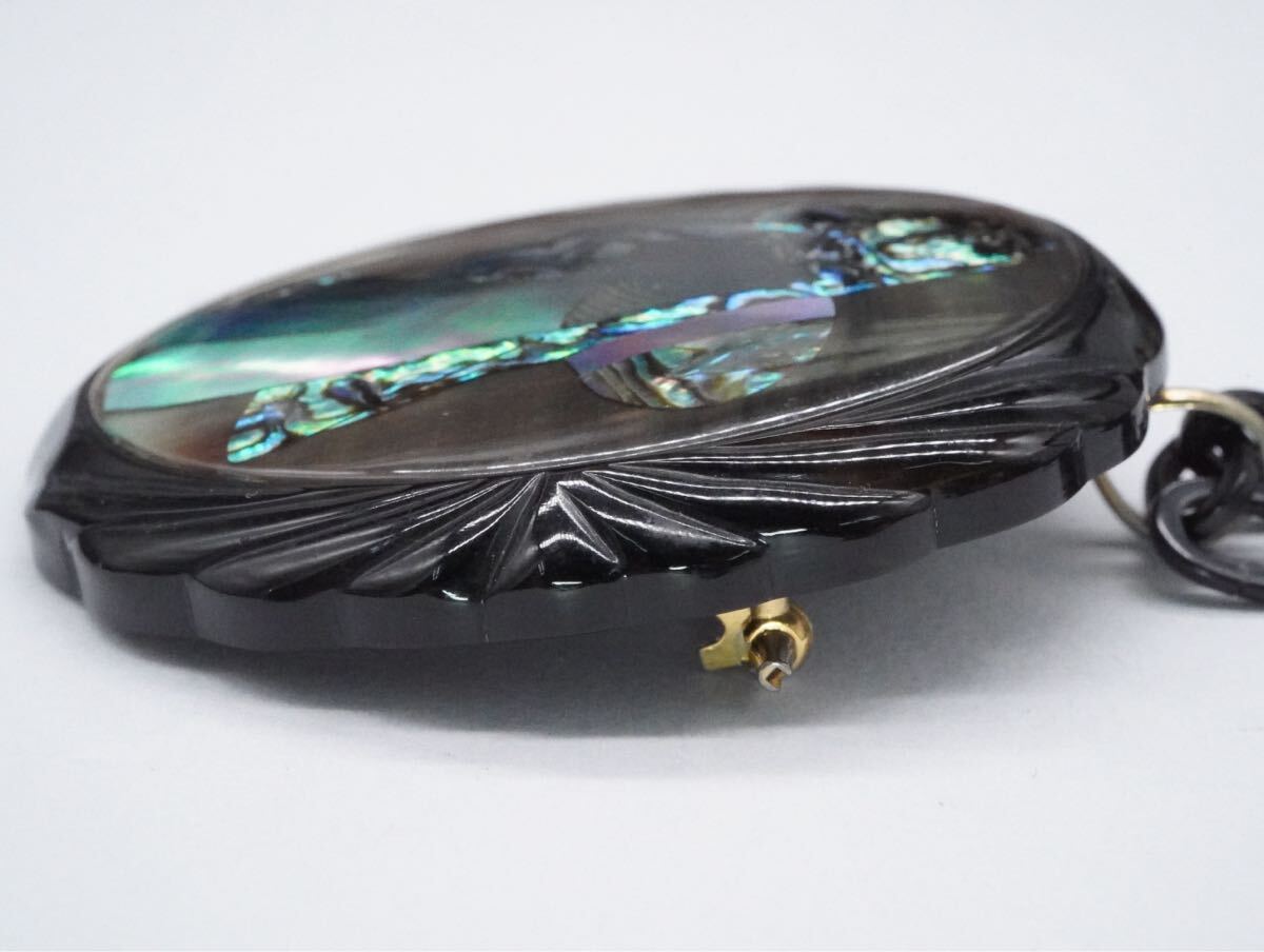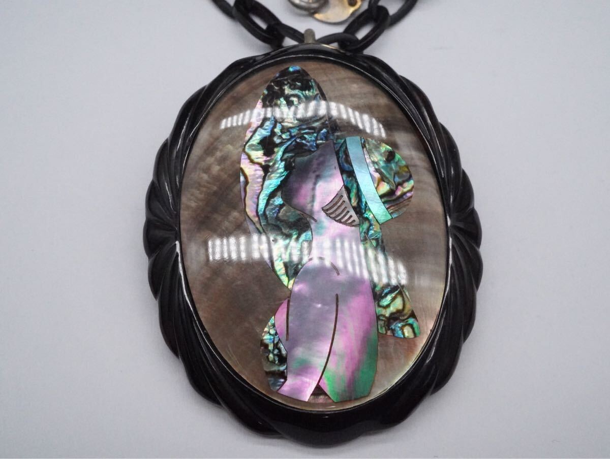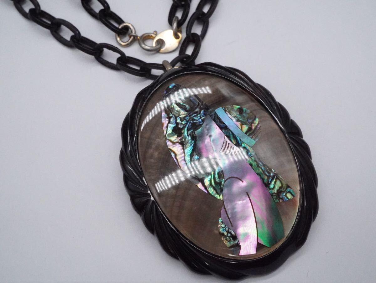 【251】黒蝶貝 アバロン 鼈甲 ベッコウ べっ甲 ロング ネックレス 長さ約62cm ブローチ アクセサリー TIA