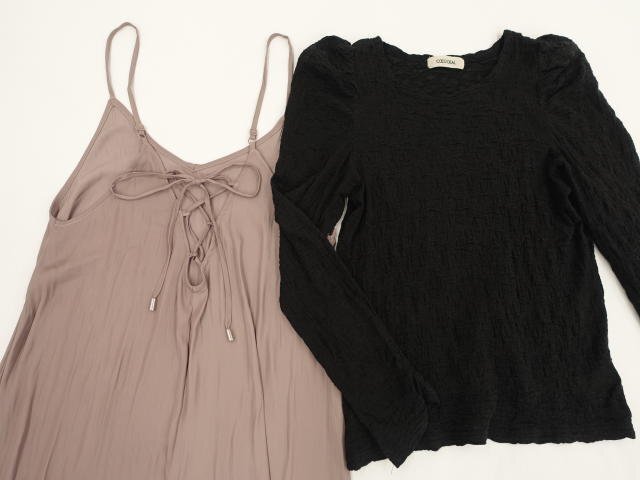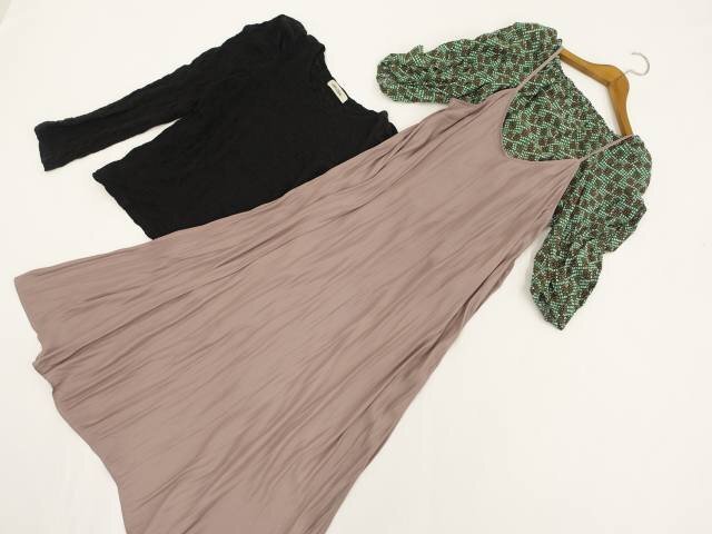 マキシ丈キャミソールワンピース+長袖カットソー+長袖プルオーバーブラウス コーディネート3点セット M相当 ピンク系/ブラック/グリーン系地 ホワイト×ブラウン 花柄 フェミニン系 20代、30代