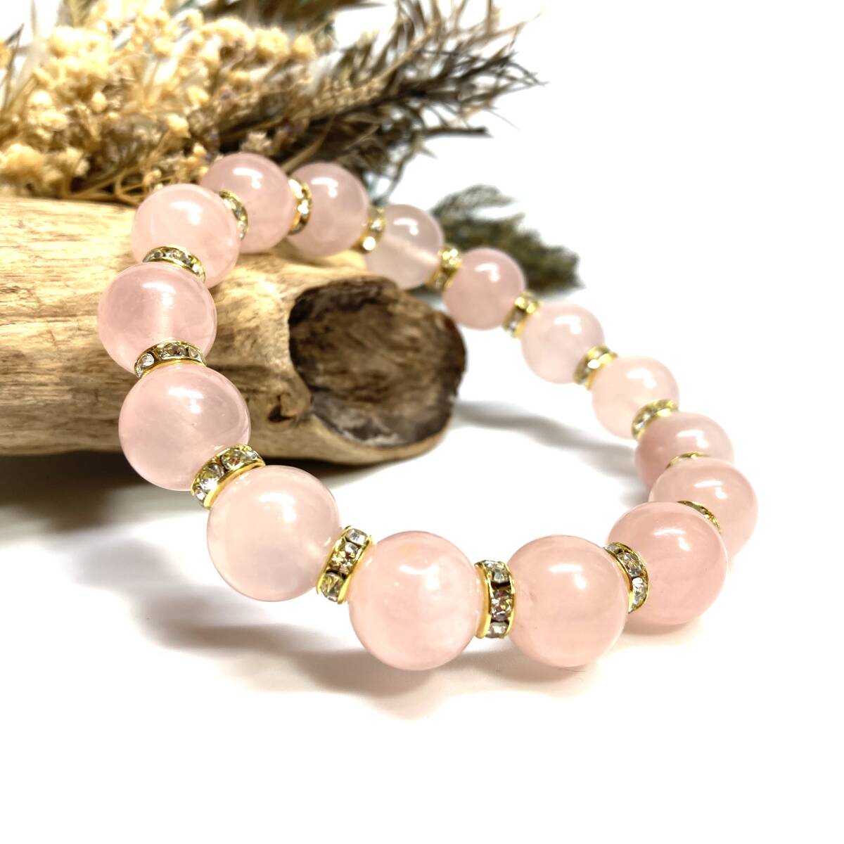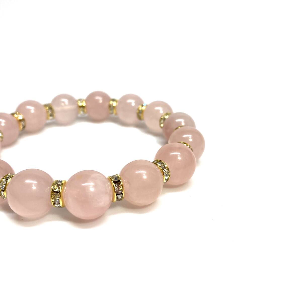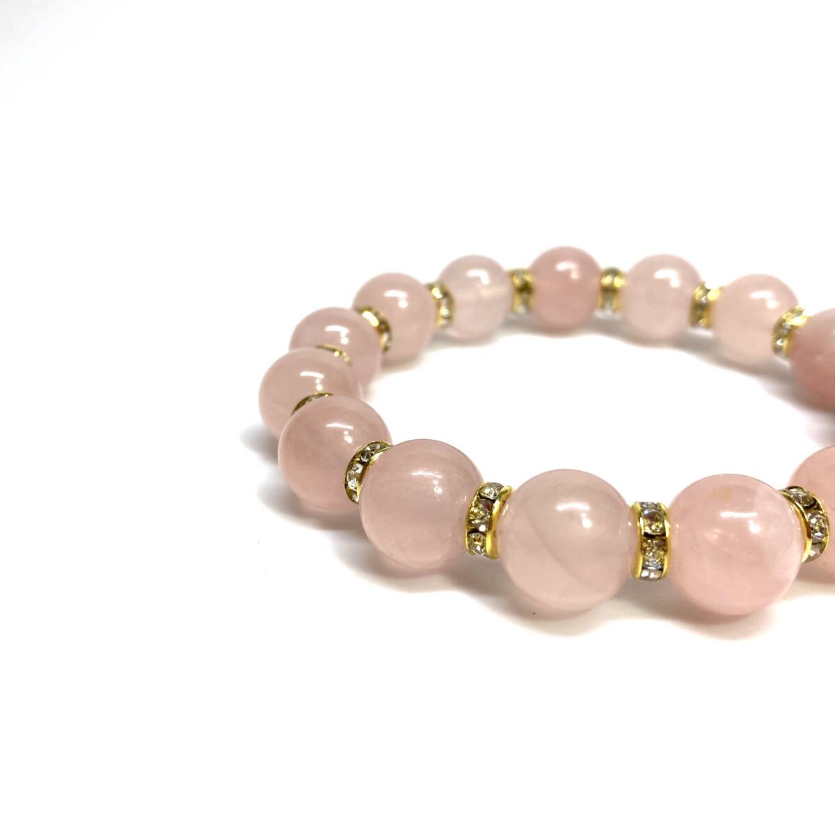 こちらは、12mm玉のローズクォーツを使用したブレスレットです。石との間にはロンデルを挟み高級感を演出しています。シンプルなデザインですのでどんなコーディネートとも合わせ易いブレスレットです。石大きさは12mm玉です。内周約18cmです。(サイズ変更の場合は取引ナビにてご連絡をお願いします。) 数に限りがございますので気になる方はお早めにどうぞ。