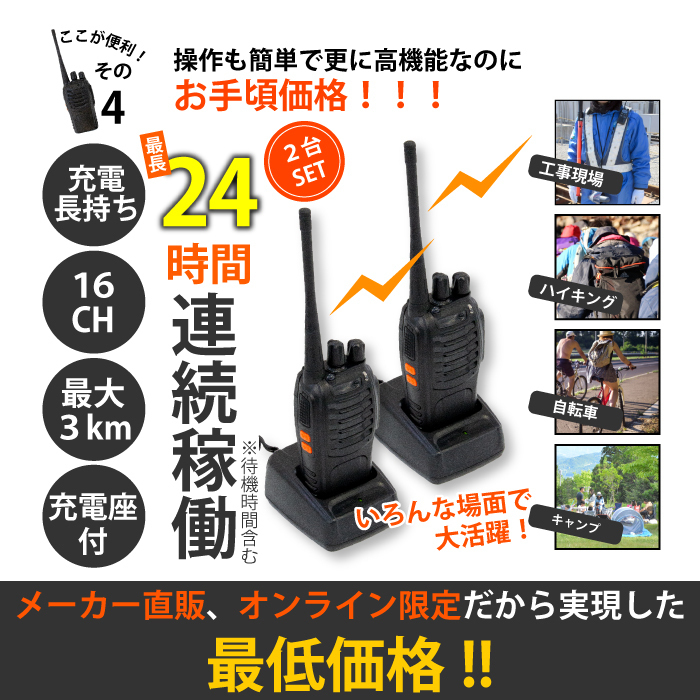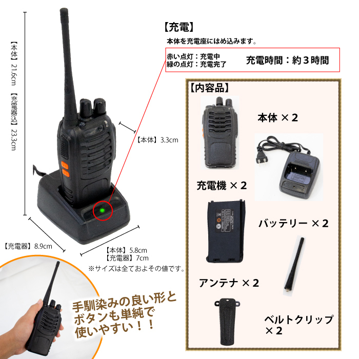 小電力トランシーバー 2台セット 充電座付 工事アウトドア、スキー、レジャー、登山、警備 長時間(BF-888)