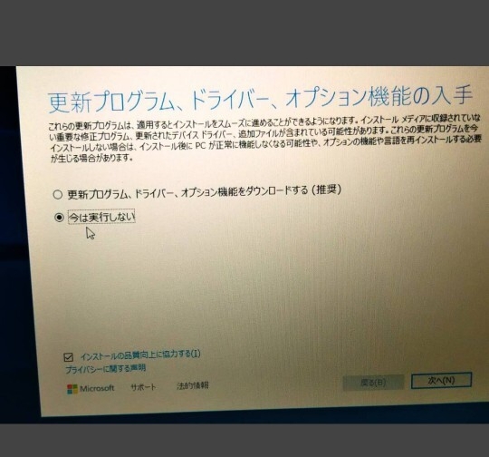 ■アップグレードに失敗しない為にインストール時に更新プログラムをインストールしないで下さい 写真参考に(今は実行しない)を選んで下さい(インストール後にアップデートしてください)