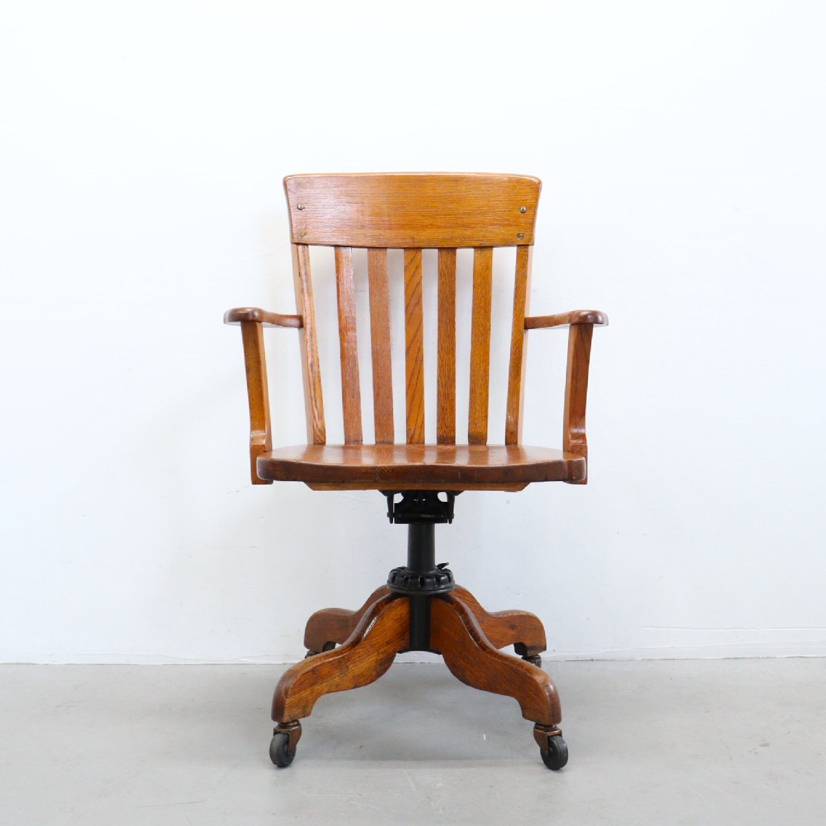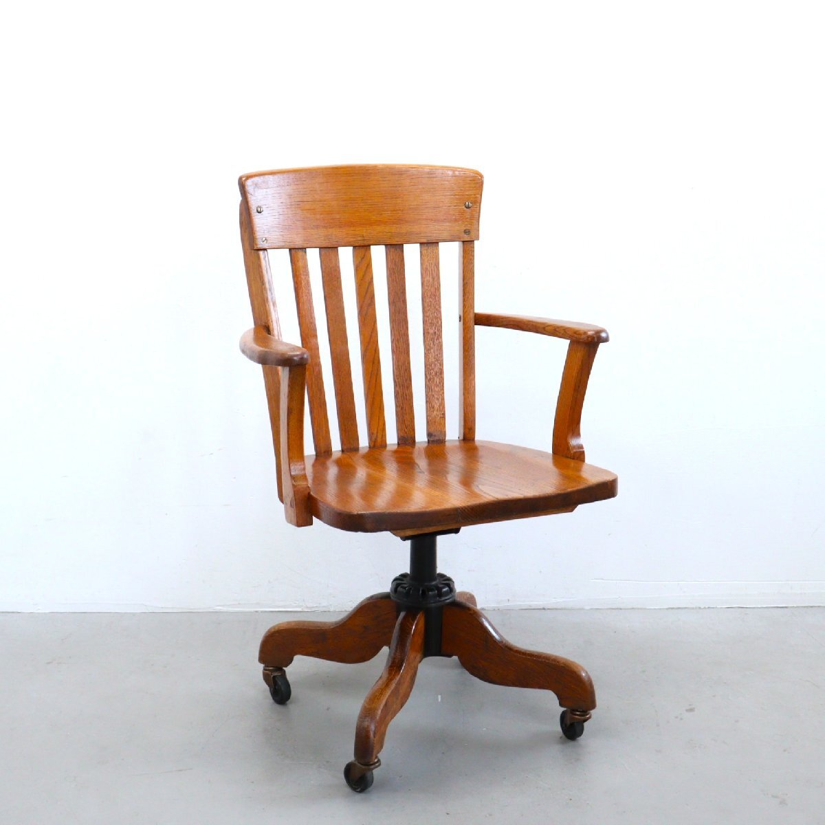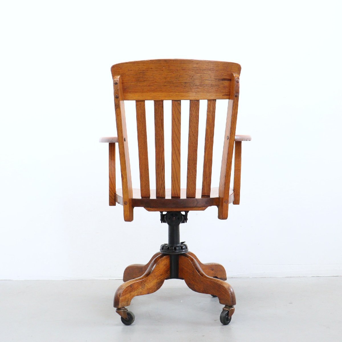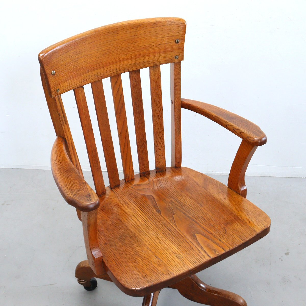 | 商品説明 explanation | 木製のヴィンテージ デスクチェアです。 詳しい年代は不明ですが、推定1930年~1950年以前に主にアメリカの図書館やオフィスなどで使用されていた椅子になります。 座面の高さとリクライニングのかたさを調整できます。 木材の風合いが良く、重厚感のあるオーセンティックなデザインです。 ご自宅やお店などにいかがでしょうか。 |
