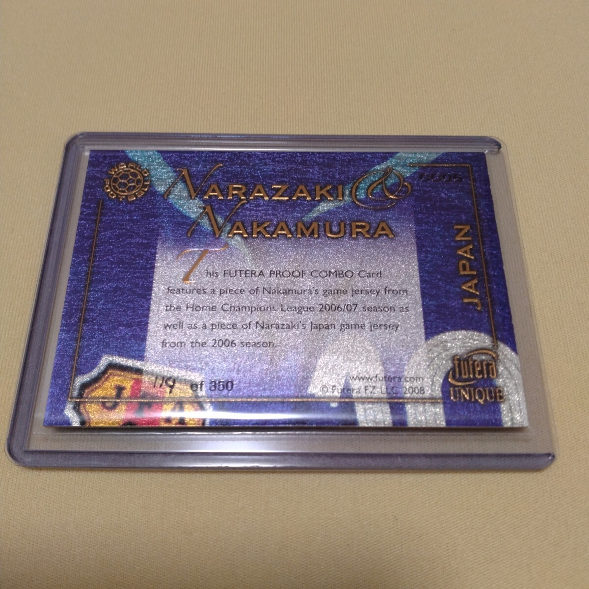 商品画像のとおり、FUTERA UNIQUE 2008より、楢崎正剛選手の日本代表のジャージと中村俊輔選手のセルティックのジャージのコンボカードです。