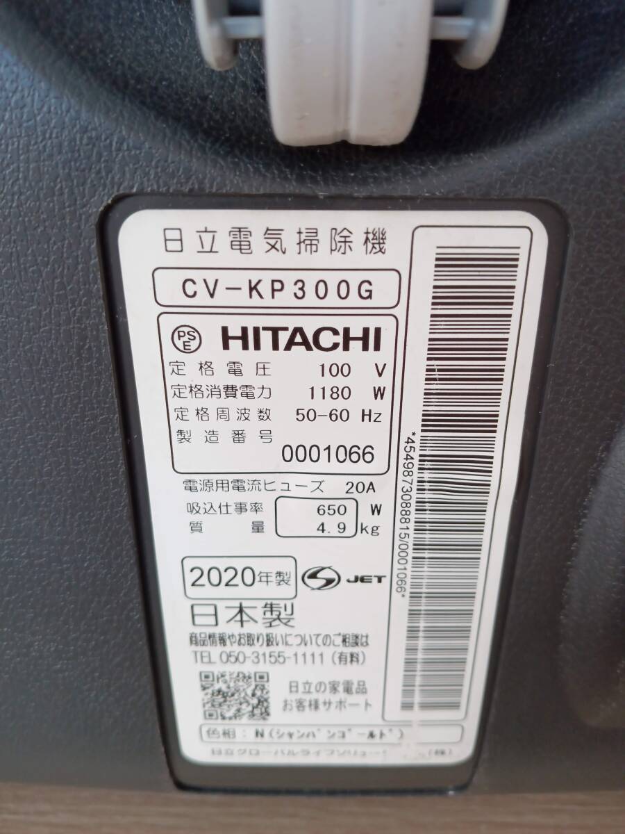 | 【BE-3922】HITACHI 日立 CV-KP300G 2020年製 紙パック式クリーナー 通電確認済 簡易掃除済 | ||