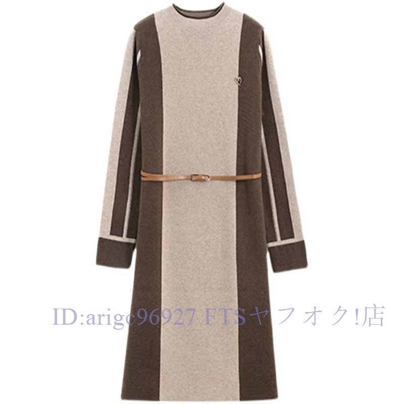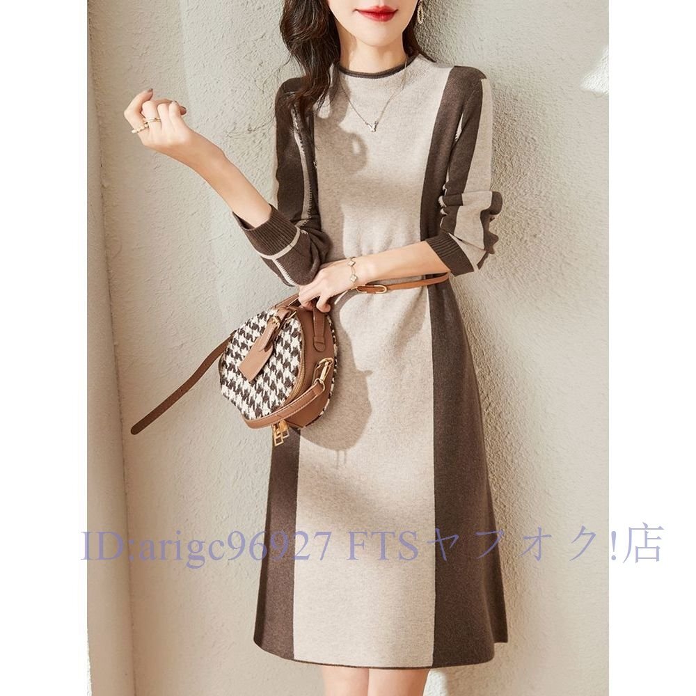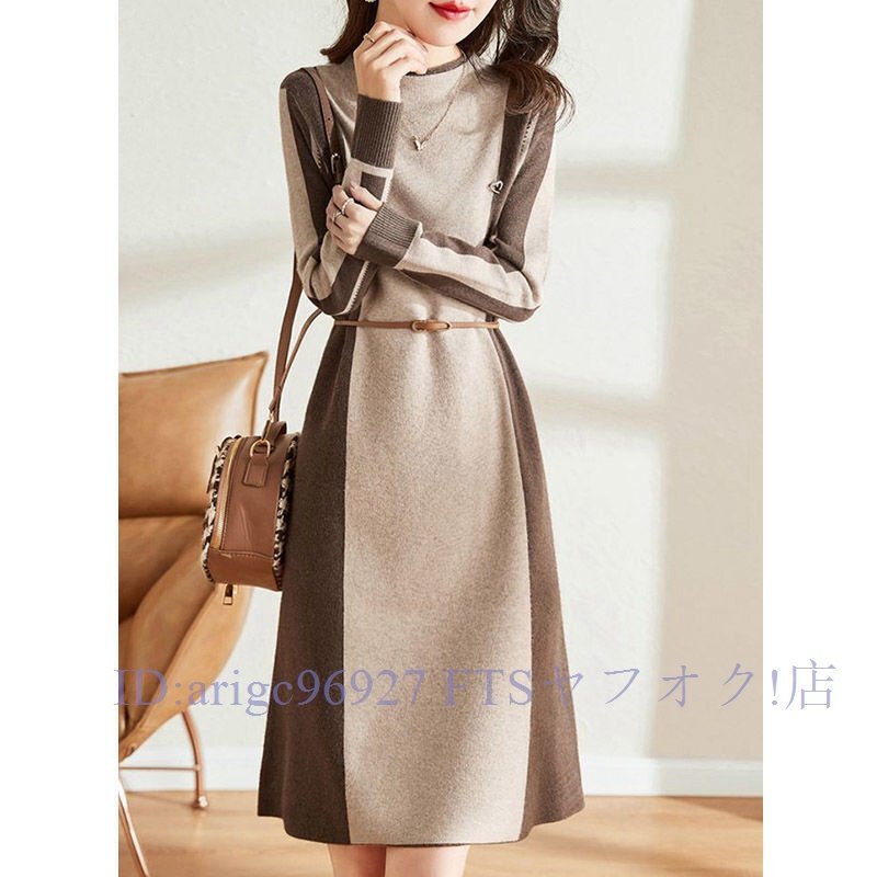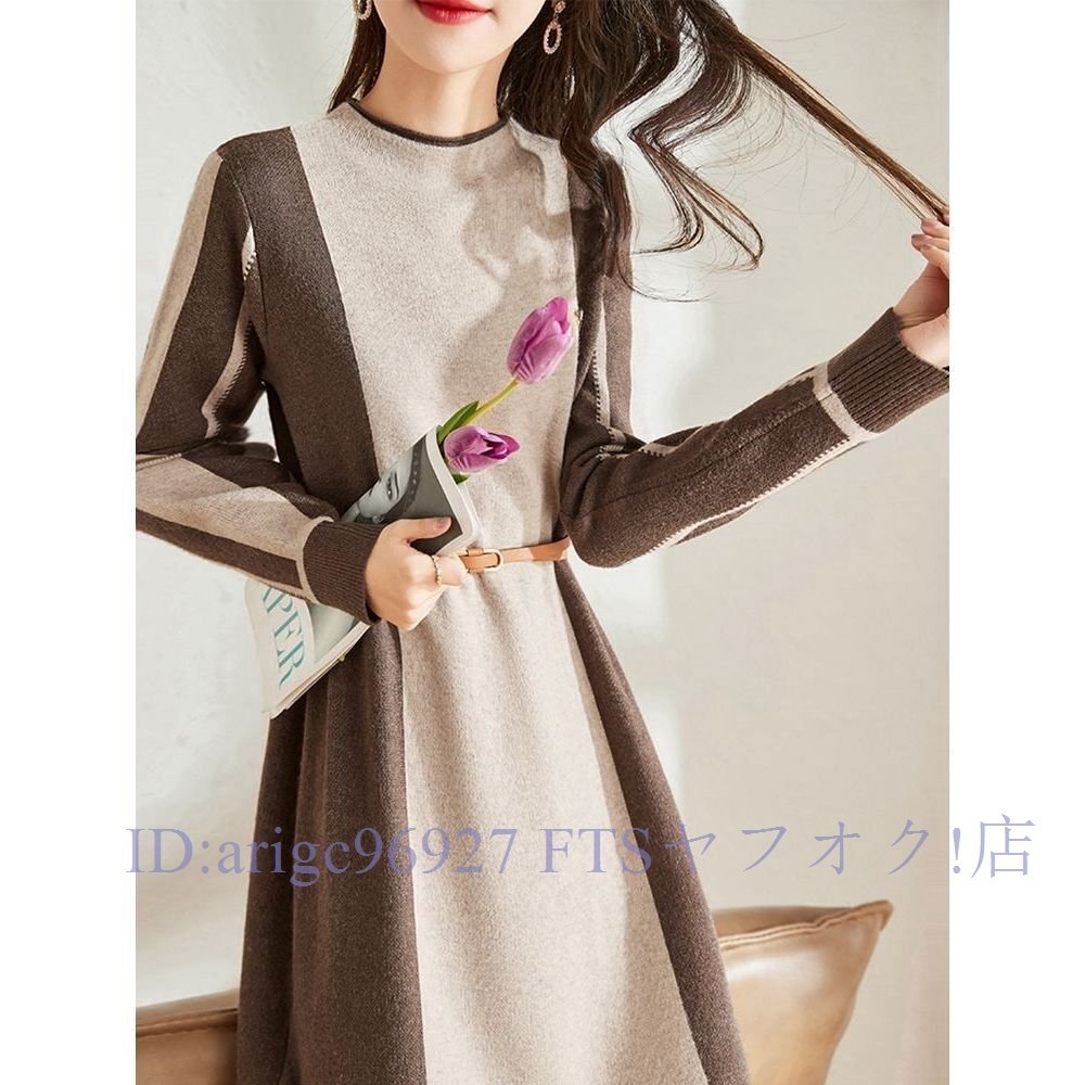 ★新品上質超綺麗きれいめ ニットワンピース 配色柄 ミンクカシミヤ混 暖かい セーター 着やせ 長袖 ロング丈ワンピース オシャレ