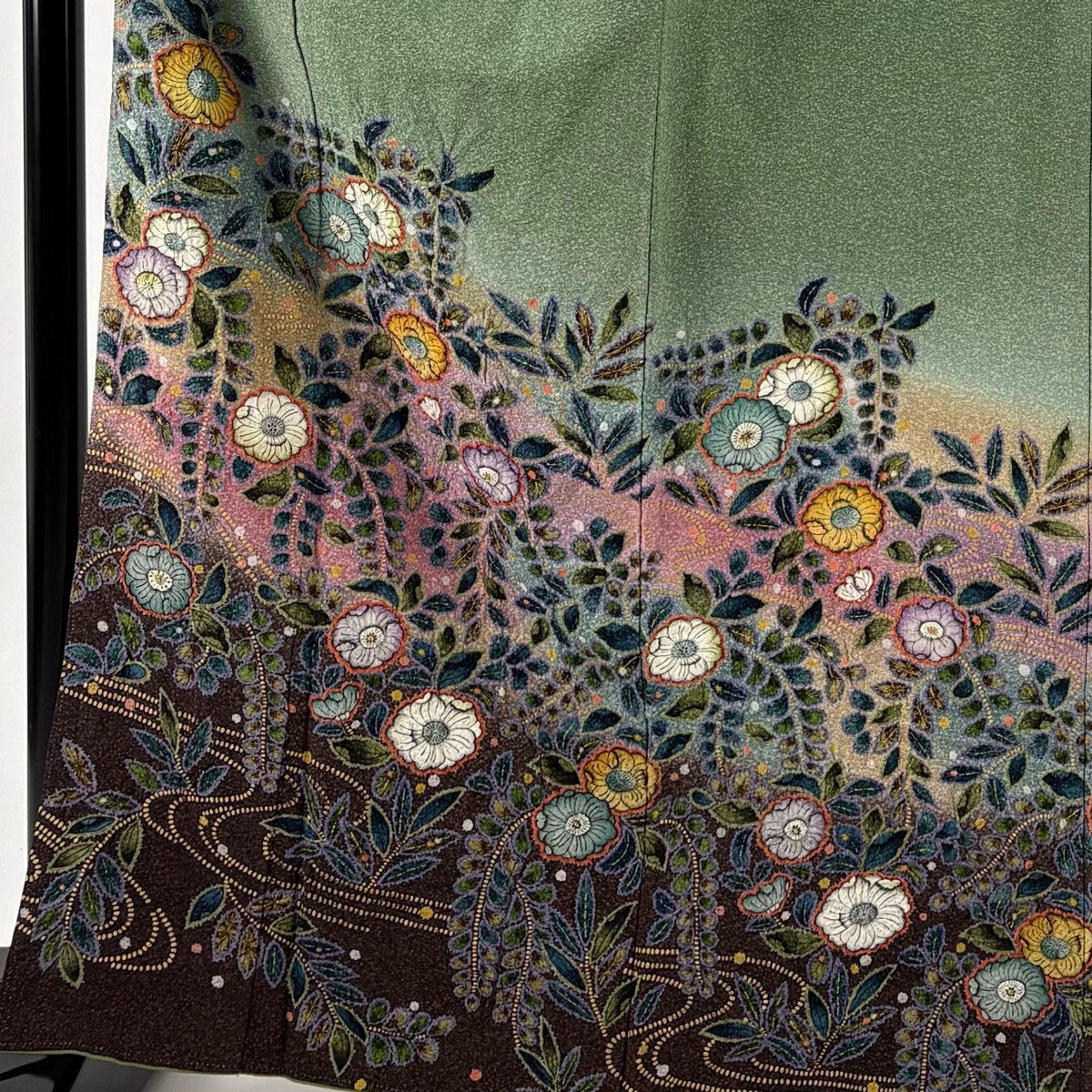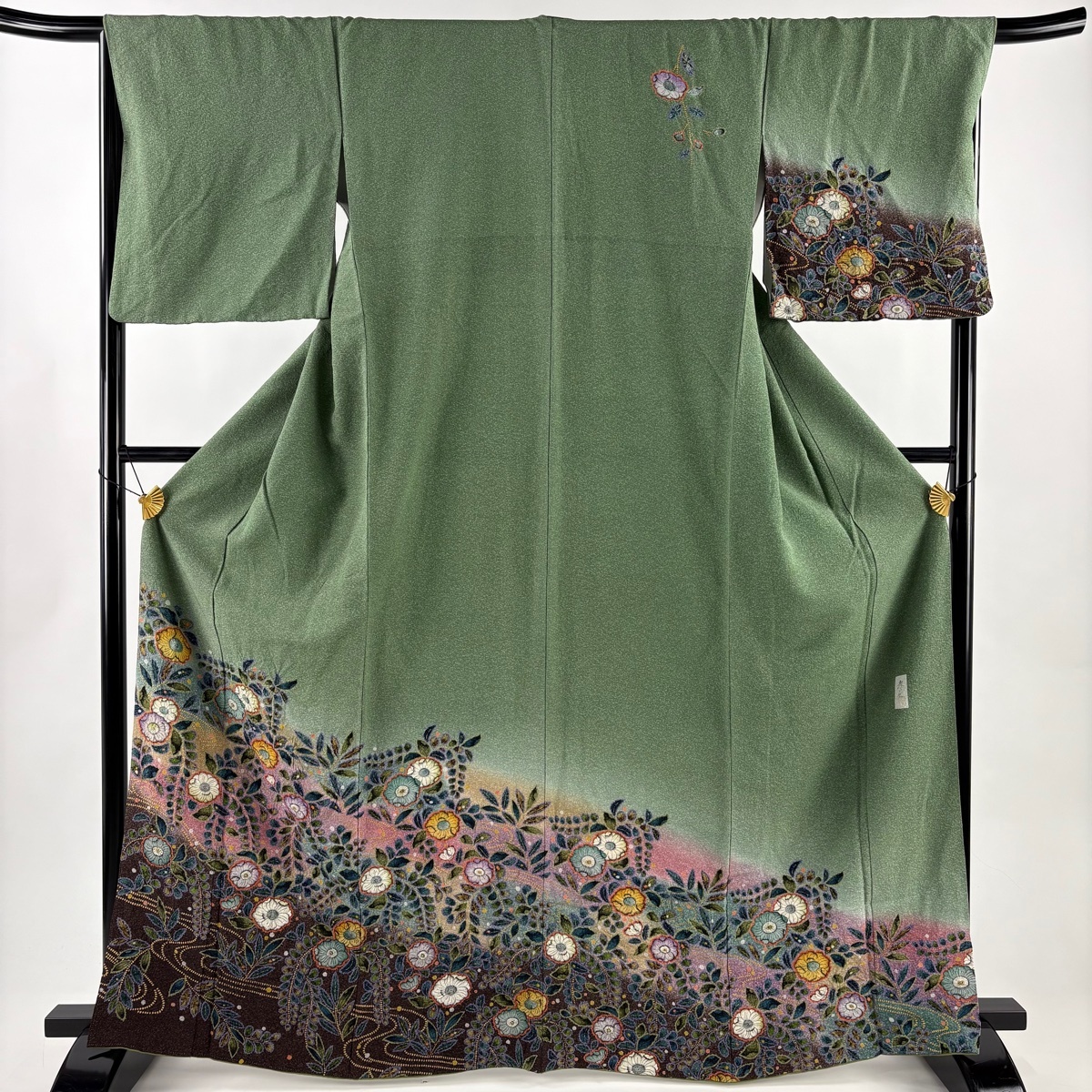 | 訪問着 名品 落款 辻が花 流水 金彩 ぼかし よもぎ色 袷 身丈166 裄丈67.5 L 正絹 【中古】 |
