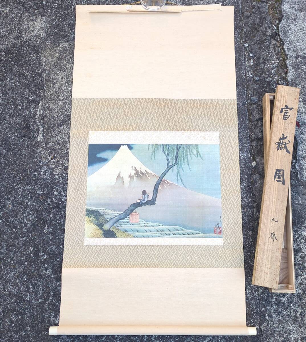 葛飾北斎 工芸品 掛軸 富嶽図 函付 共箱 浮世絵 画凶人 絹本 富嶽三十六景 赤不二之図 画狂老人 卍筆(検 広重 国芳 河鍋暁斎 芳年 歌麿