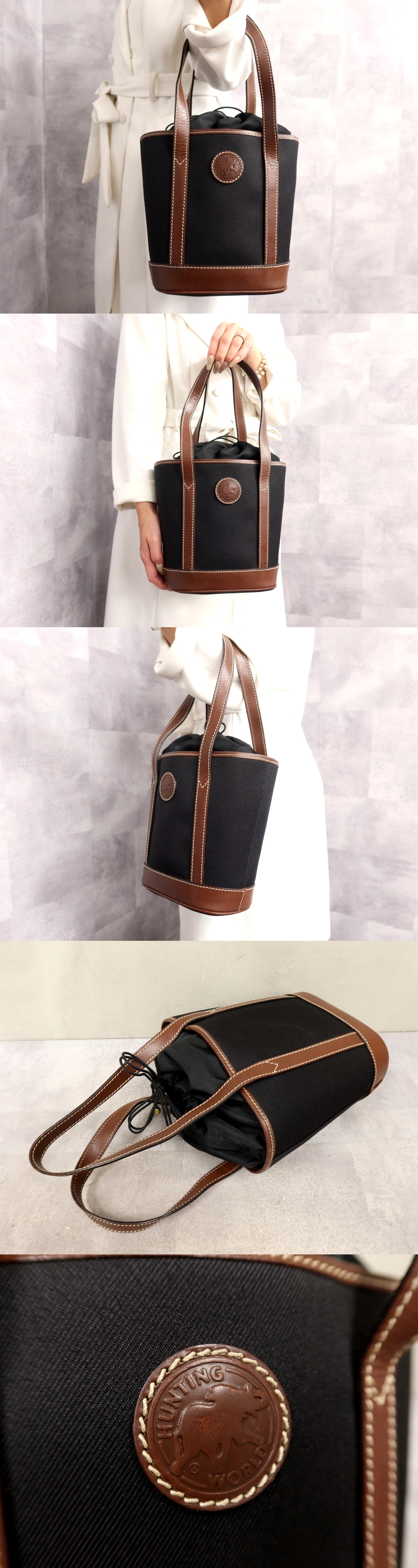 ●超美品●HUNTING WORLD ハンティング・ワールド●サファリ●ナイロン カーフ レザー 本革●ハンド バッグ●黒 ブラウン●G金具●Js63512