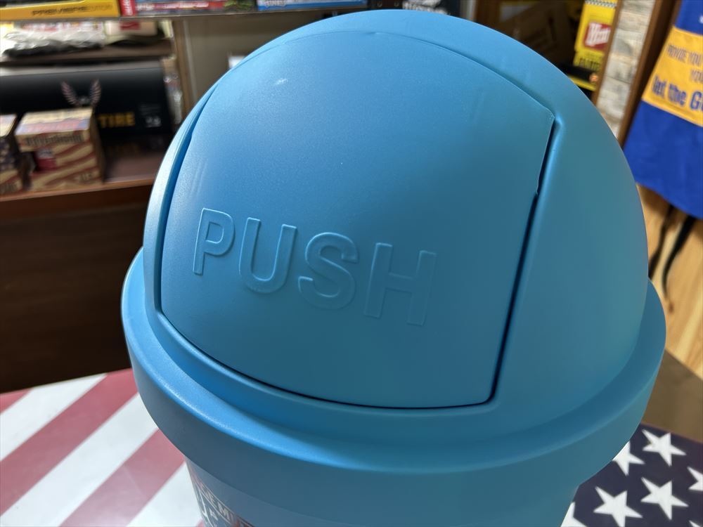 【212551】アメリカンなゴミ箱でオシャレに演出!投入部分はバネの入ったスイング式で、PUSHと浮き彫りされたデザイン。35リットルの大型サイズで、45Lのゴミ袋がすっぽりと入る大きさです。バネ式なので蓋の開け閉めが楽チンなのもGOODですね。屋内にも・屋外にも使えるゴミ箱。ゴミ箱としてだけでなく、収納BOXとして使うのもOKサイズ・容量サイズ:φ330×410mm材質:プラスチック
