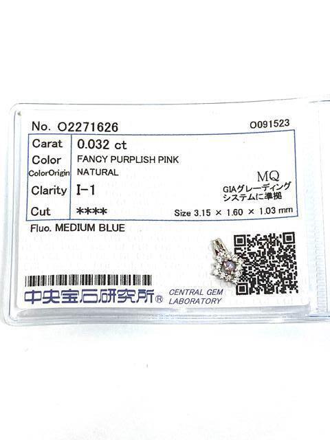 | 商品名/色 | 天然ピンクダイヤモンドペンダントトップ カラット:0.032ct カラー:FPP(FANCY PURPLISH PINK) |