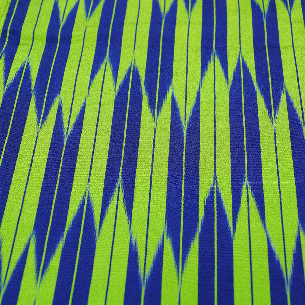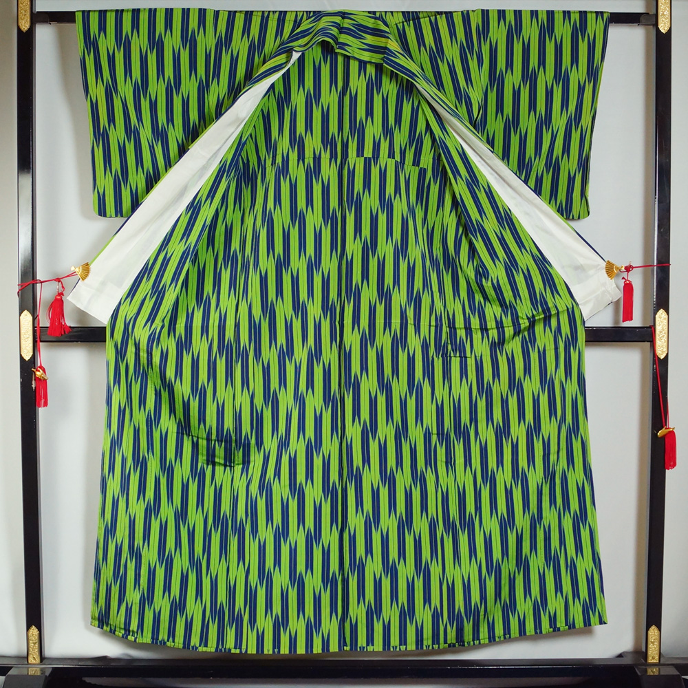 | 商品説明 | 明るい蛍光黄緑色系の地に、矢羽根模様が施された単衣のお召しです。 |