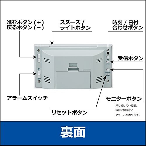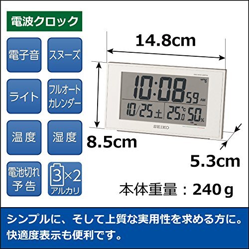 ・01:白パール 本体サイズ:8.5×14.8×5.3cm BC402W・・Color:01:白パールStyle:単品PatternName:01:通常・本体サイズ:8.5×14.8×5.3cm・素材・材質:プラスチック枠・原産国:中国・ムーブメント:電波修正機能(40kHz/60kHz自動選局・受信OFF機能つき)・付属品:単3アルカリ電池×2(電池寿命約1年間)※モニター用電池として、マンガン電池を同梱しています。・アラームオートストップ機能(約5分間) 、スヌーズつき 、ライトつき・2099年までのフルオートカレンダー機能 、温湿度表示(温度測定範囲:0℃~40℃ 測定精度: ±2℃ 湿度測定範囲:25%RH~85%RH 測定精度:±8%(25℃)・電池切れ予告機能(液晶) 、快適度表示(6段階)、12時間制/24時間制切替式シンプルに、そして上質な実用性を求める方に。快適度表示も便利です・・◆標準電波クロック・正確な時刻情報をのせた電波を受信し、・自動的に表示時刻を修正するクロックです。・・ご使用の際は、・できるだけ電波を受けやすい窓際などに置き、・電波ノイズの発生する場所は避けてください。・・●電波を受信していないときは、クオーツの精度で作動します。・・●また以下のような場所では正確に受信できない場合がありますので、・あらかじめご了承ください。・・ビルの中、ビルの谷間、地下。・・高圧線、テレビ塔、電車の架線の近く。・・テレビ、冷蔵庫、エアコン、空気清浄機、パソコン、ファクシミリ等の・家電製品やOA機器の近く。・・工事現場、空港の近くや交通量の多い所など、・電波障害の起きる所。・・乗り物の中。(自動車、電車、飛行機など。)・・その他電波ノイズを発生させるものの近く。・・スチール机等の金属製の家具の上や近く。・・※受信可能地域以外でも条件によっては受信可能な場合があります。・・◆快適度表示・一般的に知られている「不快指数」を6段階に表現しました。・緑のゾーンのときは“快適に感じ、・青のゾーンのときは“寒く、・赤のゾーンのときは“暑く感じる人が多くなります。・※体感には個人差がありますので、・快適度はあくまでも目安としてご使用ください。・・◆2018年モデル(SQ758W)との違いは・値札が付いていないので、ギフトにおすすめです。その他の機能は従来モデルと同じです。