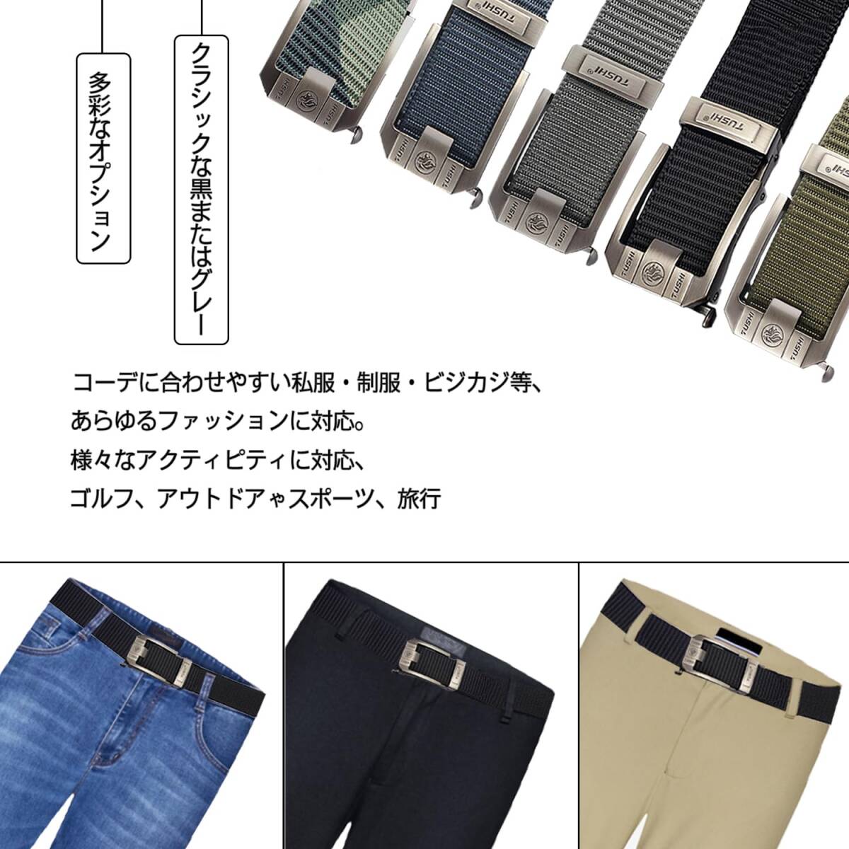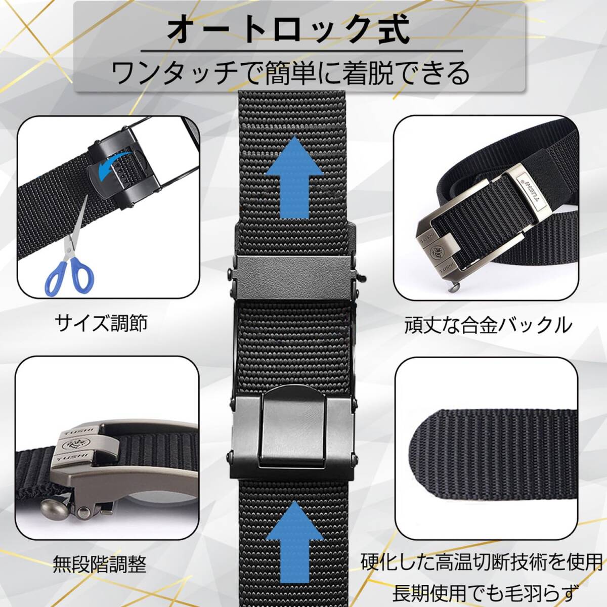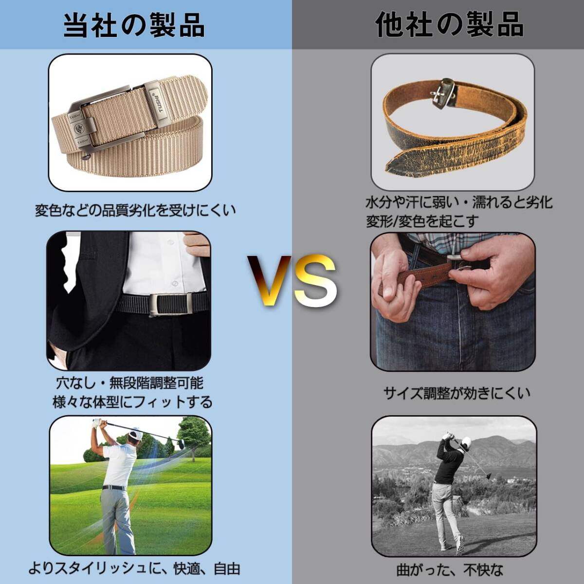 【革製ベルトを超える圧倒的な使いやすさ3つの特徴】一般的な本革ベルトは『水分や汗に弱い・濡れると劣化/変形/変色を起こす・サイズ調整が効きにくい』というデメリットがあります、しかし、このナイロンベルトは『①水や汗に強く速乾性が高い。 ②変色などの品質劣化を受けにくい。 ③様々な体型にフィットする、ベルト穴がなく好きなところで固定可能な無段階調整』。どんな体型の方でも気軽に着用でき、長時間のドライブや旅行、会食なども窮屈感なく利用できます。