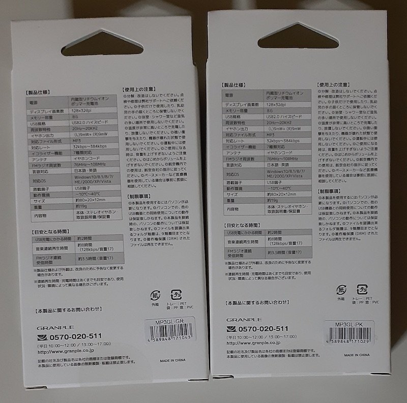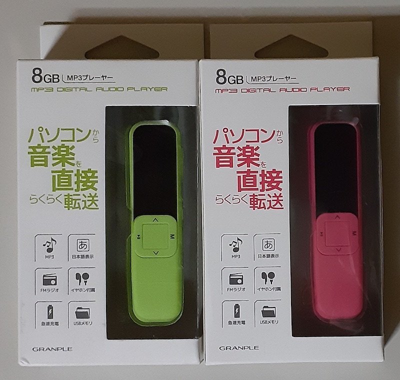 6595 未使用未開封 2色セット MP3GL-GR グリーン / MP3GL-PK ピンク FMラジオ付ポータブルオーディオプレーヤー 8GB GRANPLE パソコンから音楽を直接らくらく転送