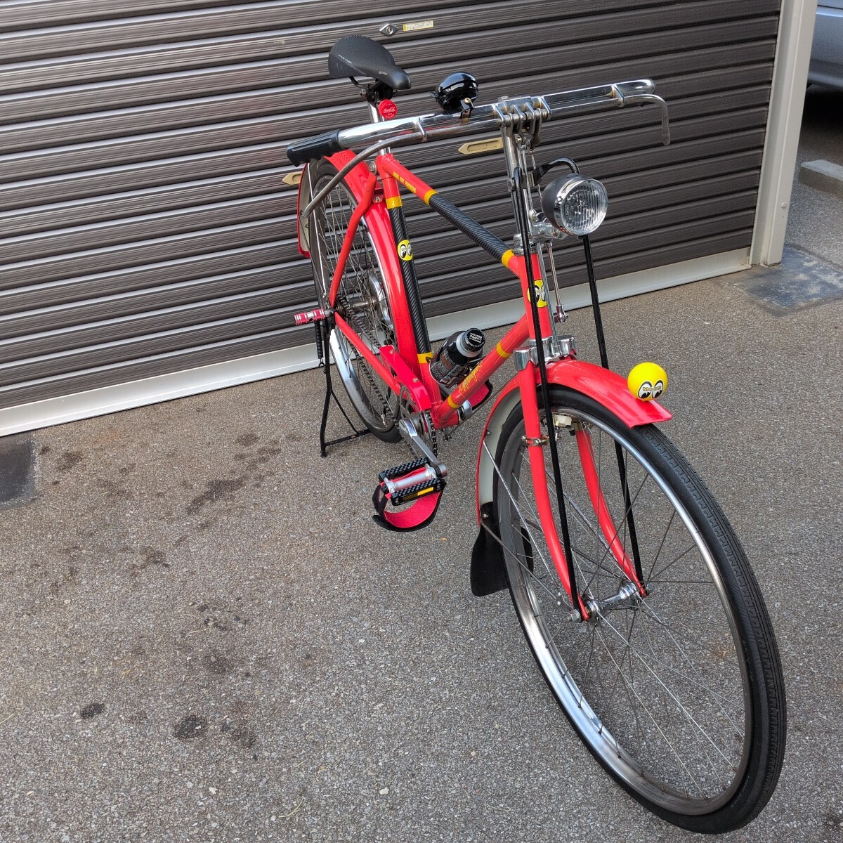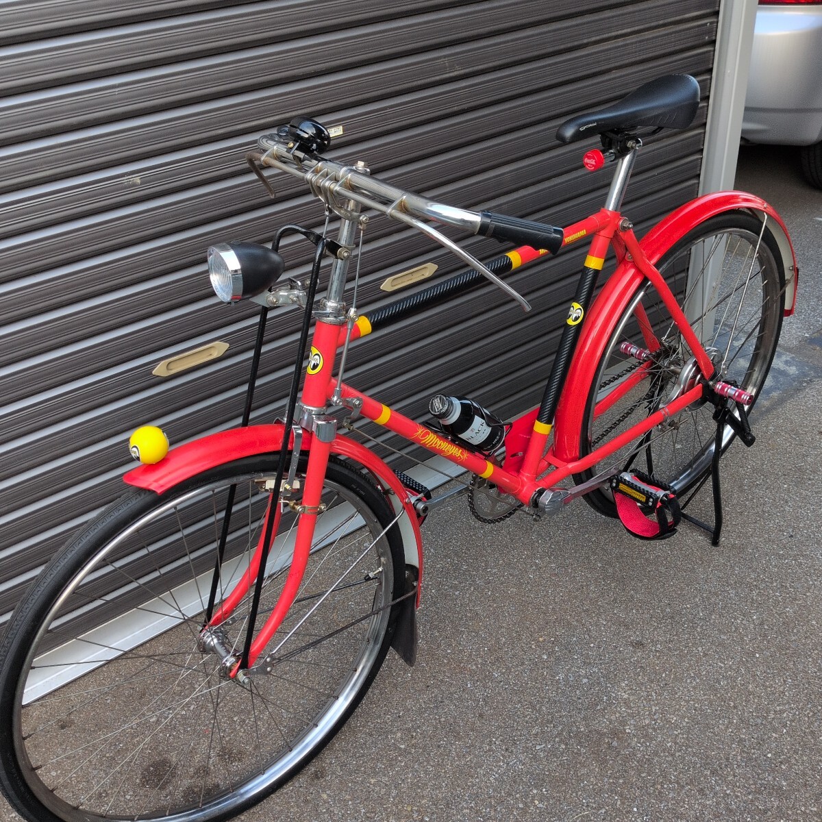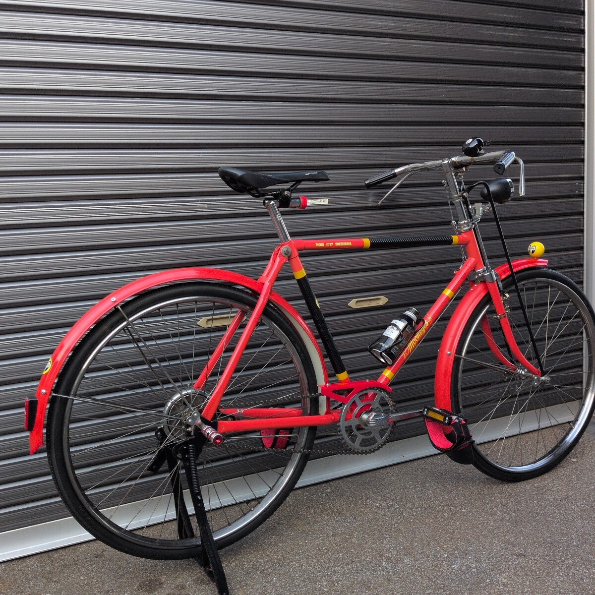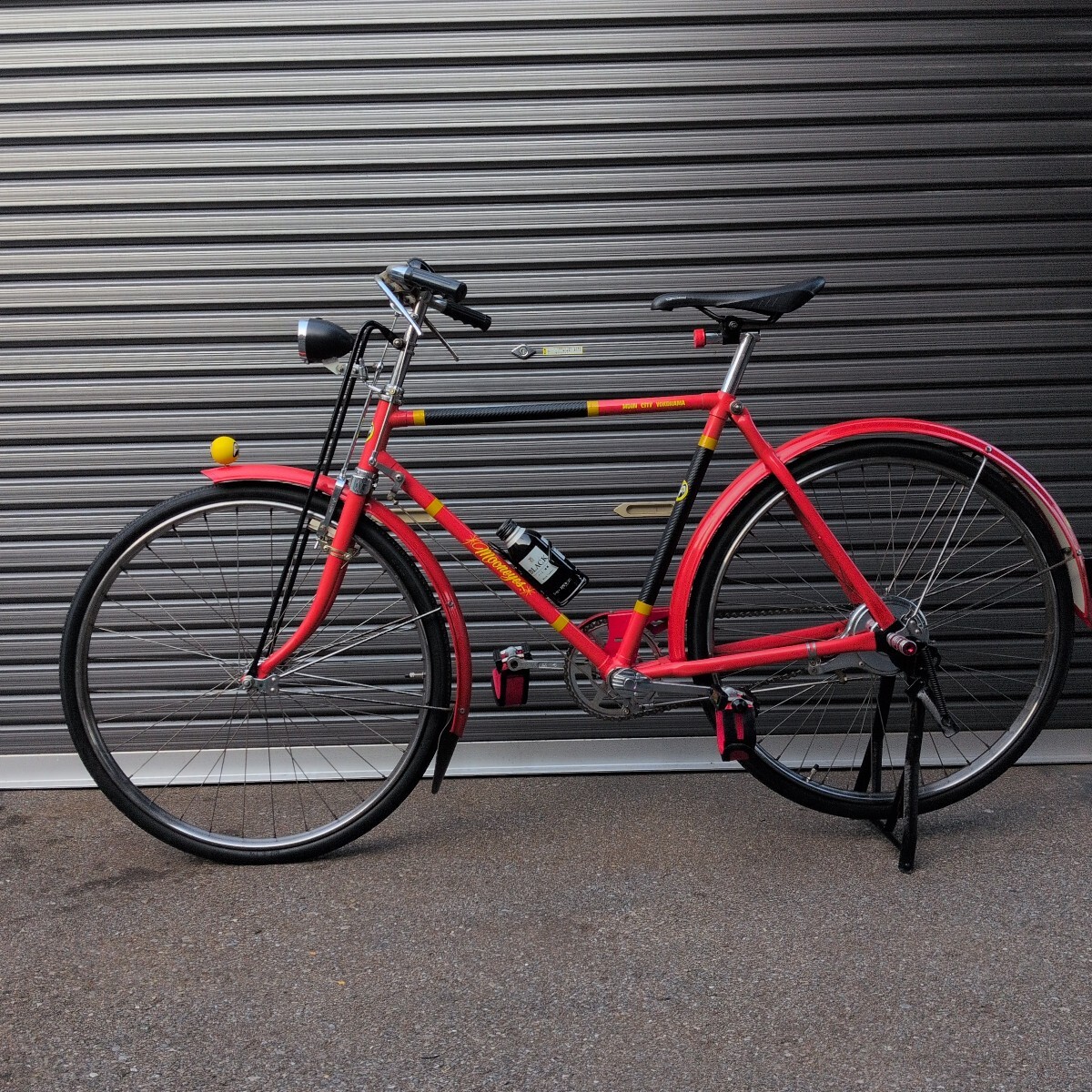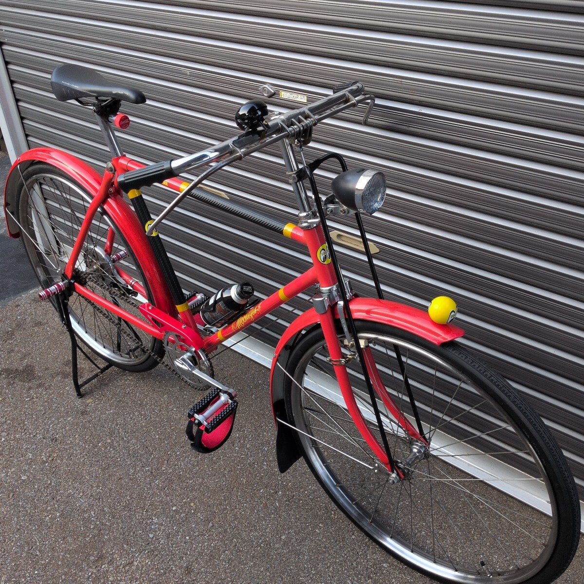 1980s頃の丸石郵政車をカッコ良く速く走れる様に改造しました。まずベース車入手後得意の全バラし洗浄磨き上げしました。まずフレームですがダウンチューブにボトル台座直付ゲージ取り付けトップチューブとシートチューブにカーラッピング用の高級カーボン柄のシート貼り付けました。縁は黄色の反射テープです。ダウンチューブにW氏のピンスト風デカールヘッドとシートチューブにムーンのマークフェンダー先端に風切代わりにカーアンテナポールを取り付けました。ホイールは新井ハブ 新家ステンリム 鉄スポーク タイヤとチューブはお馴染みシンコーのゴールデンボーイ3/8BE通称金玉の新品取り付け前後リム振れ取りハブBBヘッドグリスアップ済みです。ブレーキは新井Fオール新品リアバンドは残量有りで大丈夫です。ギアは44x20tで新品チェーン ペダルは反射付き軽合金ゴムペダルなかなか無い品です。あとスピード出す時の為にバンドストラップ赤色付けました。サドルはスポーツタイプの取り付けヘッドライトはLED電池式新品ベル新品 飛ばした時ハンドルが動くと危ないので当方オリジナルの補助バー取り付け チェーンカバーも赤色の小振りなオシャレなの取り付けました。あと後輪にハブステップ取り付け 実用自転車で速く走る事に拘って造りました。欲しい方いましたらノークレーム ノーリターン ノーキャンセルでお願いします。引き取り希望ですが西濃運輸支店止め可能です。送料は5000円位からです。西濃は伝票に電話番号記載必須の為落札された方はお知らせお願いします。栃木県宇都宮からの出品です。